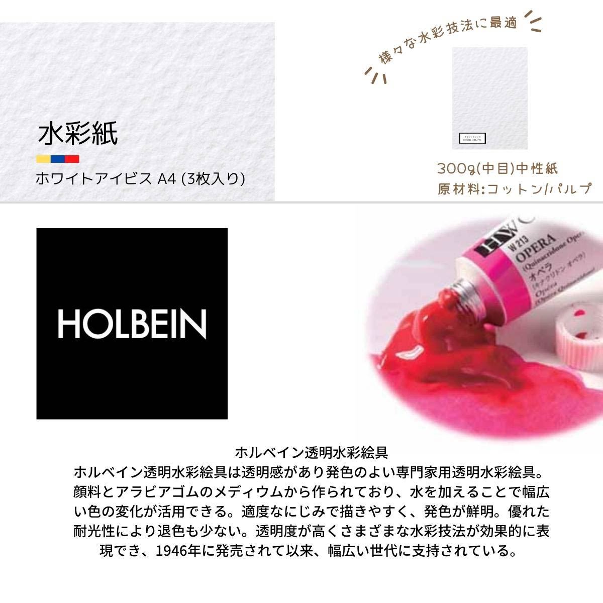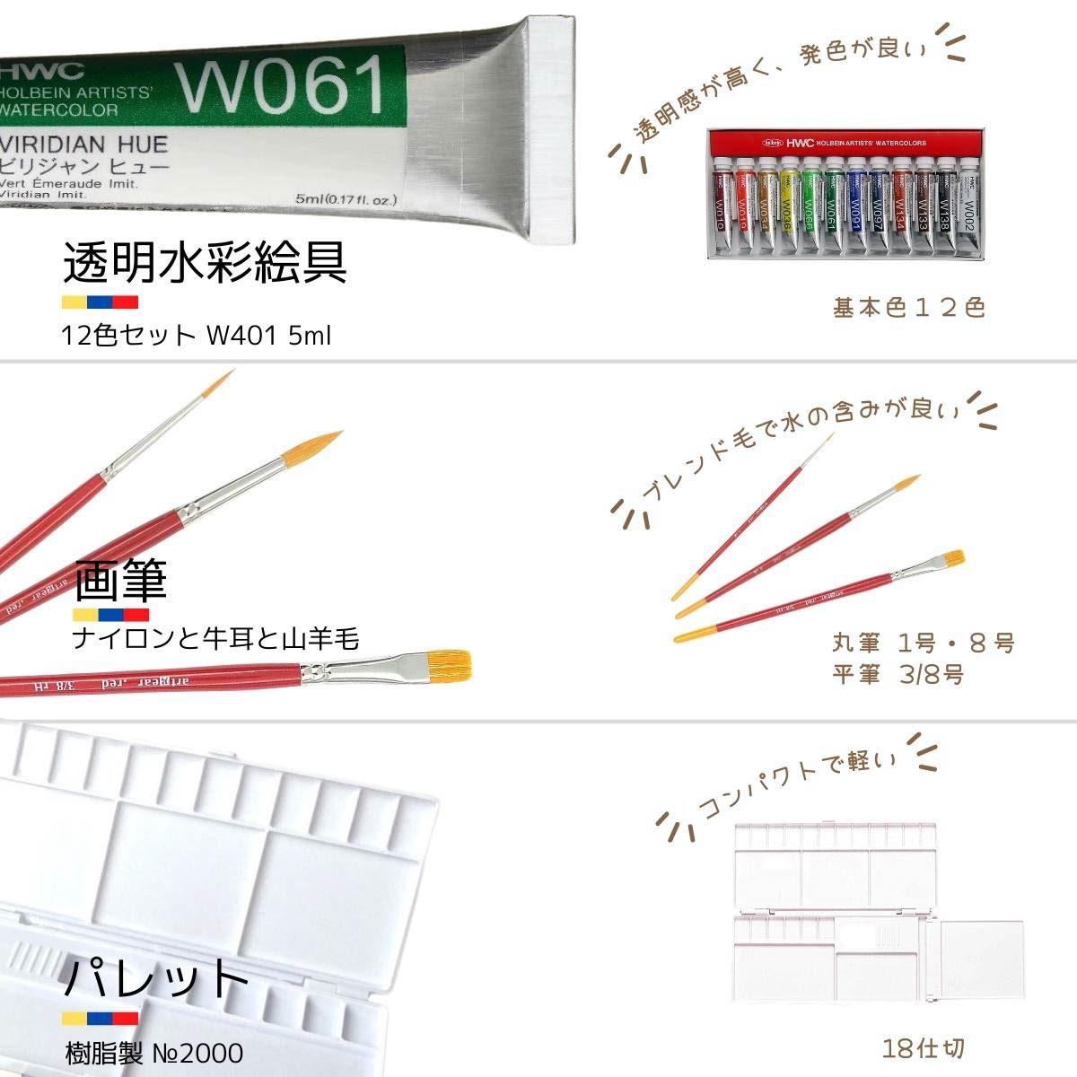 【ACLオリジナルセット】〜水彩絵具お試しセット〜artgear筆入りセット 水彩絵具がどんな商品かお試しに使い始めて頂きやすいセットとなっております。 【内容品】 ・ホルベイン 透明水彩絵具 5ml W401 12色セット ・ホルベイン プラスチック水彩パレット No.2000 ・artgear 水彩筆(レッド)丸 1号 ・artgear 水彩筆(レッド)丸 8号 ・artgear 水彩筆(レッド)平 3/8号 ・ホワイトアイビス水彩紙 A4 3枚ハ゜ック 袋入【商品情報】 注意事項:お使いのモニターの発色具合によって、実際のものと色が異なる場合がございます。