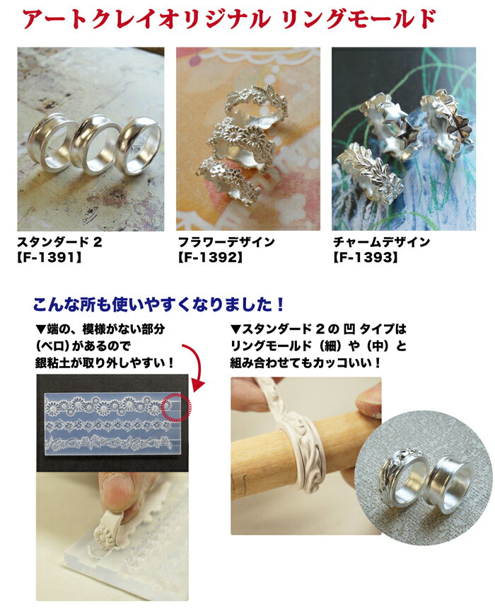 リングが作れる透明型のシリコンモールドです。 透明型なので、粘土の詰め具合も確認しやすく、作品の完成度が高まります。 このモールドでは、模様の入っていない方から銀粘土を取り出すことで最大24号(焼成後:約20号)のリング制作が可能です。 乾燥後、リングの内側を削る事で2号程度までサイズを大きくする事が可能です。 素材:ソフトシリコーンゴム サイズ:約37×85×厚み5mm ※作品例 ★シルバーアクセサリーレシピ集はこちら!