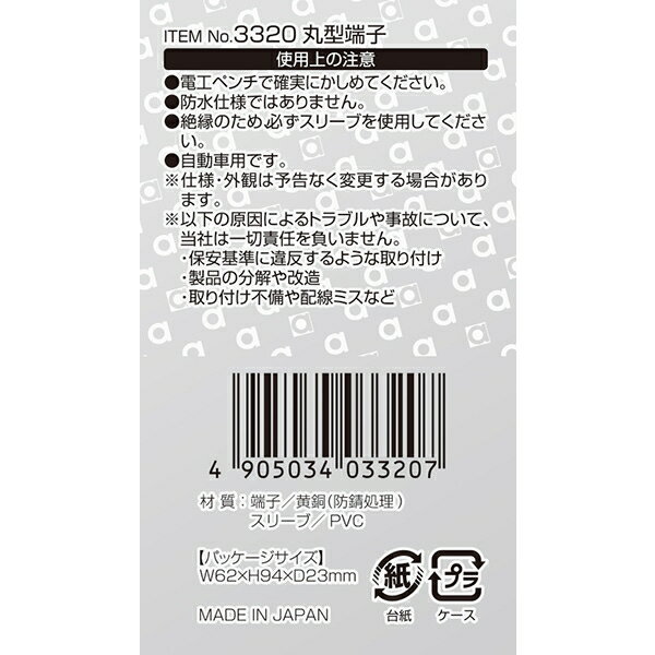 バッテリーからの電源取り出しに【仕様】・使用可能電力: DC12V車 200W以下 DC24V車 400W以下・適合コードサイズ: AV(S)0.5~2sq・φ8 【内容物】・入数:7個■メーカー:エーモン工業株式会社■品番:3320商品説明商品・パッケージは予告なく仕様変更する場合があります。メール便対応商品です。◆追跡サービス◆ 差し出しからお届けまでの配送状況をご確認頂けます。◆配達方法◆ 宅配便:対面受渡もしくは宅配ボックス等となります。 メール便:お届け先の郵便受けに配達致します。◆配達日◆ 宅配便:日曜・祝日等でも配達可能です。 メール便:日曜・祝日は原則配達されません。◆お届けまでの日数◆ 宅配便:おおむね発送日から1~2日前後でお届け致します。 メール便:おおむね発送日から2~5日前後でお届け致します。 但し、お届け先が遠方の場合や離島などの一部地域の場合など、 さらに数日要する場合が御座います。 お急ぎの場合は宅配便をご利用下さい。※メール便注意事項※■郵便受けに配達されるため代金引換はご利用頂けません。■翌日配送サービスには対応しておりません。また、配達日時指定も出来ません。■メール便対応商品を複数ご購入頂いた場合や、メール便対応外商品と同梱での発送の場合、 宅配便で発送する場合が御座いますので、予めご了承下さい。※メール便の場合の返品交換について※■配達中の商品破損、紛失があった場合でも保証、交換等は対応致しかねます。万が一、ご購入商品と違った商品が届いた場合には交換対応させて頂きます。