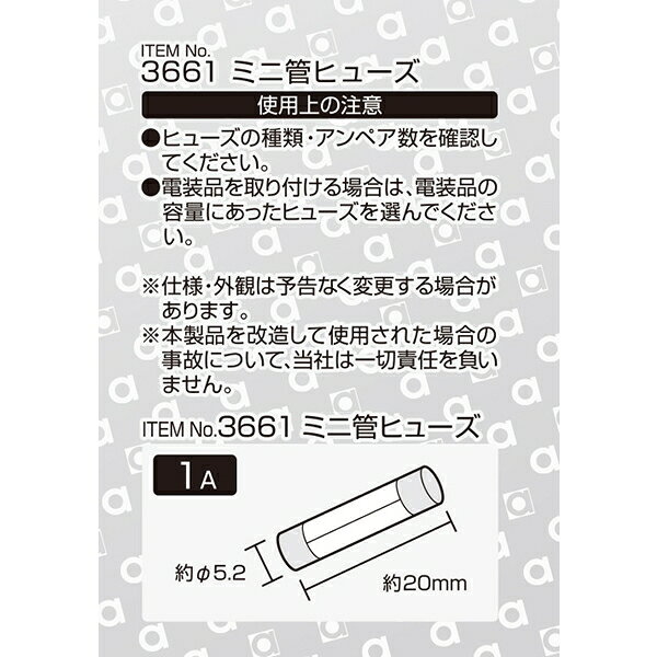 自動車ヒューズの交換に【仕様】・約φ5.2 × 長さ約20mm【内容物】・1A × 5本入■メーカー:エーモン工業株式会社■品番:3661商品説明商品・パッケージは予告なく仕様変更する場合があります。メール便対応商品です。◆追跡サービス◆ 差し出しからお届けまでの配送状況をご確認頂けます。◆配達方法◆ 宅配便:対面受渡もしくは宅配ボックス等となります。 メール便:お届け先の郵便受けに配達致します。◆配達日◆ 宅配便:日曜・祝日等でも配達可能です。 メール便:日曜・祝日は原則配達されません。◆お届けまでの日数◆ 宅配便:おおむね発送日から1~2日前後でお届け致します。 メール便:おおむね発送日から2~5日前後でお届け致します。 但し、お届け先が遠方の場合や離島などの一部地域の場合など、 さらに数日要する場合が御座います。 お急ぎの場合は宅配便をご利用下さい。※メール便注意事項※■郵便受けに配達されるため代金引換はご利用頂けません。■翌日配送サービスには対応しておりません。また、配達日時指定も出来ません。■メール便対応商品を複数ご購入頂いた場合や、メール便対応外商品と同梱での発送の場合、 宅配便で発送する場合が御座いますので、予めご了承下さい。※メール便の場合の返品交換について※■配達中の商品破損、紛失があった場合でも保証、交換等は対応致しかねます。万が一、ご購入商品と違った商品が届いた場合には交換対応させて頂きます。