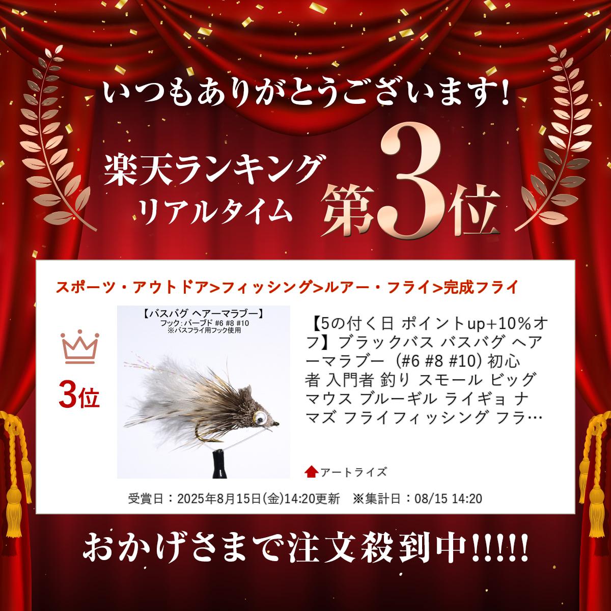 バス用のフックを使用し一般的な同じサイズのフックよりも大きくなります。 フックの全長については以下のとおりとなっております。 #2:40mm #6:36mm #8:32mm #10:30mm パターン名:バスバグフライタイプ:バス用フライ 主な使い方:ブラックバスやライギョなどの肉食魚に イメージ:ネズミや小魚など 対応フック:バーブド(返しあり) サイズ #6 #8 #10一言: ブラックバスをメインにライギョ、ナマズ、ブルーギルなどを対象にしたフライパターン。 藻やアシなど、ストラクチャー際を攻めるバスフィッシングを考慮し、フックにはウィードガードが装着されているのが特徴です。 【重要・確認】フライは天然マテリアルを使用している為、画像とカラーが一致しない事があります。バス用のフックを使用し一般的な同じサイズのフックよりも大きくなります。 フックの全長については以下のとおりとなっております。 #2:40mm #6:36mm #8:32mm #10:30mm パターン名:バスバグフライタイプ:バス用フライ 主な使い方:ブラックバスやライギョなどの肉食魚に イメージ:ネズミや小魚など 対応フック:バーブド(返しあり) サイズ #6 #8 #10一言: ブラックバスをメインにライギョ、ナマズ、ブルーギルなどを対象にしたフライパターン。 藻やアシなど、ストラクチャー際を攻めるバスフィッシングを考慮し、フックにはウィードガードが装着されているのが特徴です。 【重要・確認】フライは天然マテリアルを使用している為、画像とカラーが一致しない事があります。