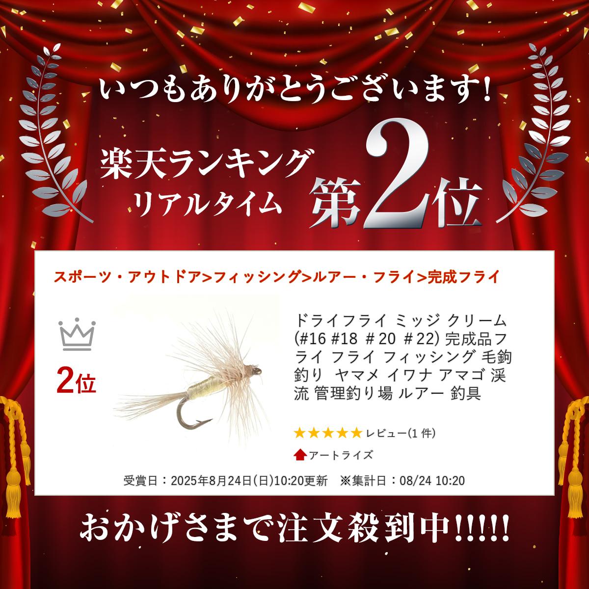 パターン名:ミッジフライ主な使い方:対応フック:バーブド(返しあり) バーブレス(返しなし) サイズ:#16 #18 #20 #22一言:ミッジフライは小型の水生昆虫を演出したフライパターンで、おもにユスリカをイミートしたフライになります。とくに早春に他の水生昆虫のハッチが少ない時に活躍します。早春の渓流でのライズはミッジに対するライズが多く、解禁したばっかりの渓流では欠かせないパターン。【重要・確認】フライは天然マテリアルを使用している為、画像とカラーが一致しない事があります。 フックはフライパターンによって同一サイズでも大きさが違う場合が御座います。 【ターゲット】 ウエッフライのターゲットはトラウトだけではありません。様々な肉食の魚なども対象となります。 在来種:イワナ、ヤマメ、アマゴ、サクラマス、サツキマス、アメマス、ヒメマス等々 外来種:レインボートラウト(ニジマス)、ブルックトラウト、ブラウントラウト、レイクトラウト等々 【関連ワード】 海 管理釣り場 ベスト リール セット 投げ方 リーダー 道具 小物 おすすめ 店 高級 値段 対象魚 タックル 関東 フライ 人気 ベストシーズン ベストの中身 長さ 結び方 太さ リーダーシステム 選び方 ティペット 代用 初心者 ショップ テーパーリーダー 手作り 手袋 トラウト ナマズ 流し方 入門セット 入門 ニンフ 日本 ニンフ 仕掛け ニンフの使い方 ネット 完成フライ ストリーマー 毛鉤屋 通販 アートライズ エルクヘアカディス 渓流 ルアー フライフィッシングパターン名:ミッジフライ主な使い方:対応フック:バーブド(返しあり) バーブレス(返しなし) サイズ:#16 #18 #20 #22一言:ミッジフライは小型の水生昆虫を演出したフライパターンで、おもにユスリカをイミートしたフライになります。とくに早春に他の水生昆虫のハッチが少ない時に活躍します。早春の渓流でのライズはミッジに対するライズが多く、解禁したばっかりの渓流では欠かせないパターン。【重要・確認】フライは天然マテリアルを使用している為、画像とカラーが一致しない事があります。 フックはフライパターンによって同一サイズでも大きさが違う場合が御座います。