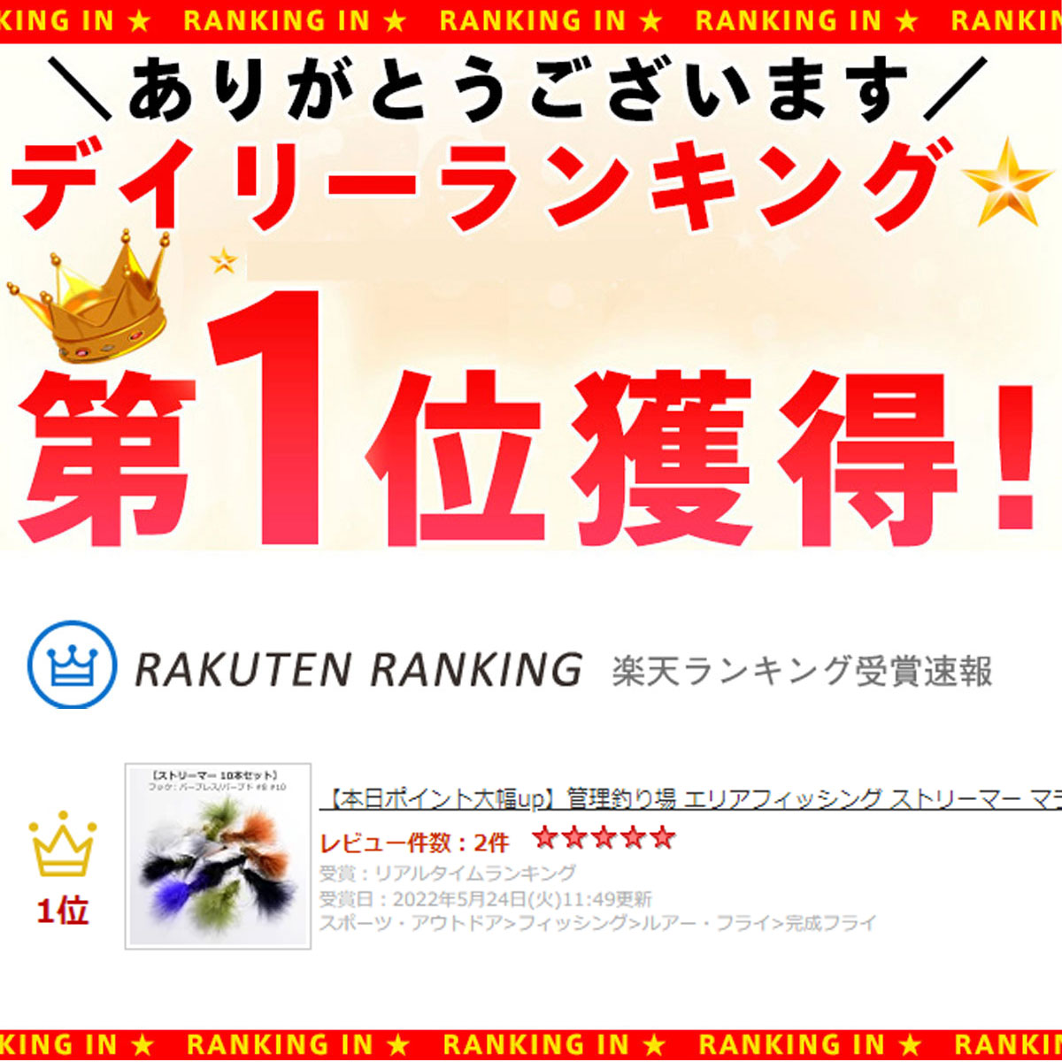 ポンドタイプの管理釣り場で実績の高い人気のストリーマーセット。 管理釣り場(エリアフィッシング)では多くの施設がキャッチ&リリースです。 トラウトへのダメージを最小に抑える為にバーブレスフックをご使用ください。 (施設によってはバーブレスフック使用が義務になっています) 【ストリーマーでの釣り方】 トラウトが表層を泳いでいる場合は、軽めのストリーマーで泳がせて使います。この場合はシンキングラインを使わずドライフライ用のラインでも使えます。 表層にいない場合は重いシンキングラインを使ったり、フライ自体を重い物に変えていきます。 【パッケージ内用】 ・マラブー ウーリーバガー カラー(ブラックオリーブ オリーブ ブラウン ブラック) ・ビーズタイプ マラブーウーリーバガー カラー(ブラウン ホワイト オリーブ ブラック パープル) ・マラブー グレーゴースト 合計10本 【フック形状】 バーブレスタイプ(返しなし) 【フライサイズ】 #8 #10 でお選びください。 【フライフィッシングで釣れる魚】 カツオ マグロ カサゴ ナマズ ライギョ フナ カサゴ ムラソイ スズキ など【重要・確認】フライは天然マテリアルを使用している為、画像とカラーが一致しない事があります。フックはフライパターンによって同一サイズでも大きさが違います。