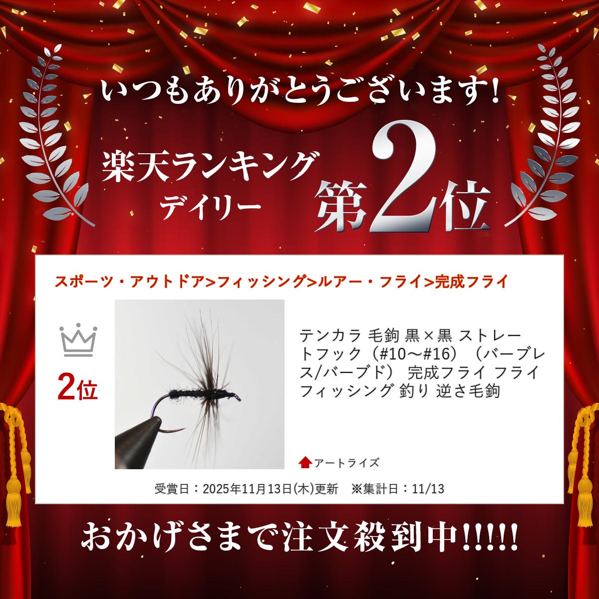 テンカラ毛鉤 オールブラック(縦巻きハックル #10~#16) 全身を黒で統一し、シルエットの強さで魚に存在を示す定番パターン。 黒ハックルの縦巻きが水中で微妙な動きを生み、深場や逆光でもしっかりアピール。 シビアな状況でも信頼できる一本です。 ■ 商品情報 タイプ:テンカラ毛鉤(縦巻きソフトハックル) サイズ:#10 / #12 / #14 / #16 仕様:バーブレス(返しなし)・バーブド(返しあり) 販売形式:1本単位 ■ 特徴 ・黒一色の強いシルエットが魚の視界にしっかり残る ・縦巻きハックルが生命感ある揺らぎを演出 ・光量の少ない場面や深いレンジにも対応 ■ 使用におすすめの場面 ・ローライトや逆光下での釣り ・深場や流れの強いポイントへのアプローチ ・ナチュラル系が効かない状況でのローテーション ■ アートライズのこだわり 黒の存在感を最大限に活かすため、ボディとハックルの質感を統一。 縦巻き仕様にすることで水の抵抗を受けやすく、ナチュラルな動きが持続します。 テンカラの定番として、一本は持っておきたい仕上がりです。テンカラ毛鉤 オールブラック(縦巻きハックル #10〜#16) 全身を黒で統一し、シルエットの強さで魚に存在を示す定番パターン。 黒ハックルの縦巻きが水中で微妙な動きを生み、深場や逆光でもしっかりアピール。 シビアな状況でも信頼できる一本です。 ■ 商品情報 タイプ:テンカラ毛鉤(縦巻きソフトハックル) サイズ:#10 / #12 / #14 / #16 仕様:バーブレス(返しなし)・バーブド(返しあり) 販売形式:1本単位 ■ 特徴 ・黒一色の強いシルエットが魚の視界にしっかり残る ・縦巻きハックルが生命感ある揺らぎを演出 ・光量の少ない場面や深いレンジにも対応 ■ 使用におすすめの場面 ・ローライトや逆光下での釣り ・深場や流れの強いポイントへのアプローチ ・ナチュラル系が効かない状況でのローテーション ■ アートライズのこだわり 黒の存在感を最大限に活かすため、ボディとハックルの質感を統一。 縦巻き仕様にすることで水の抵抗を受けやすく、ナチュラルな動きが持続します。 テンカラの定番として、一本は持っておきたい仕上がりです。