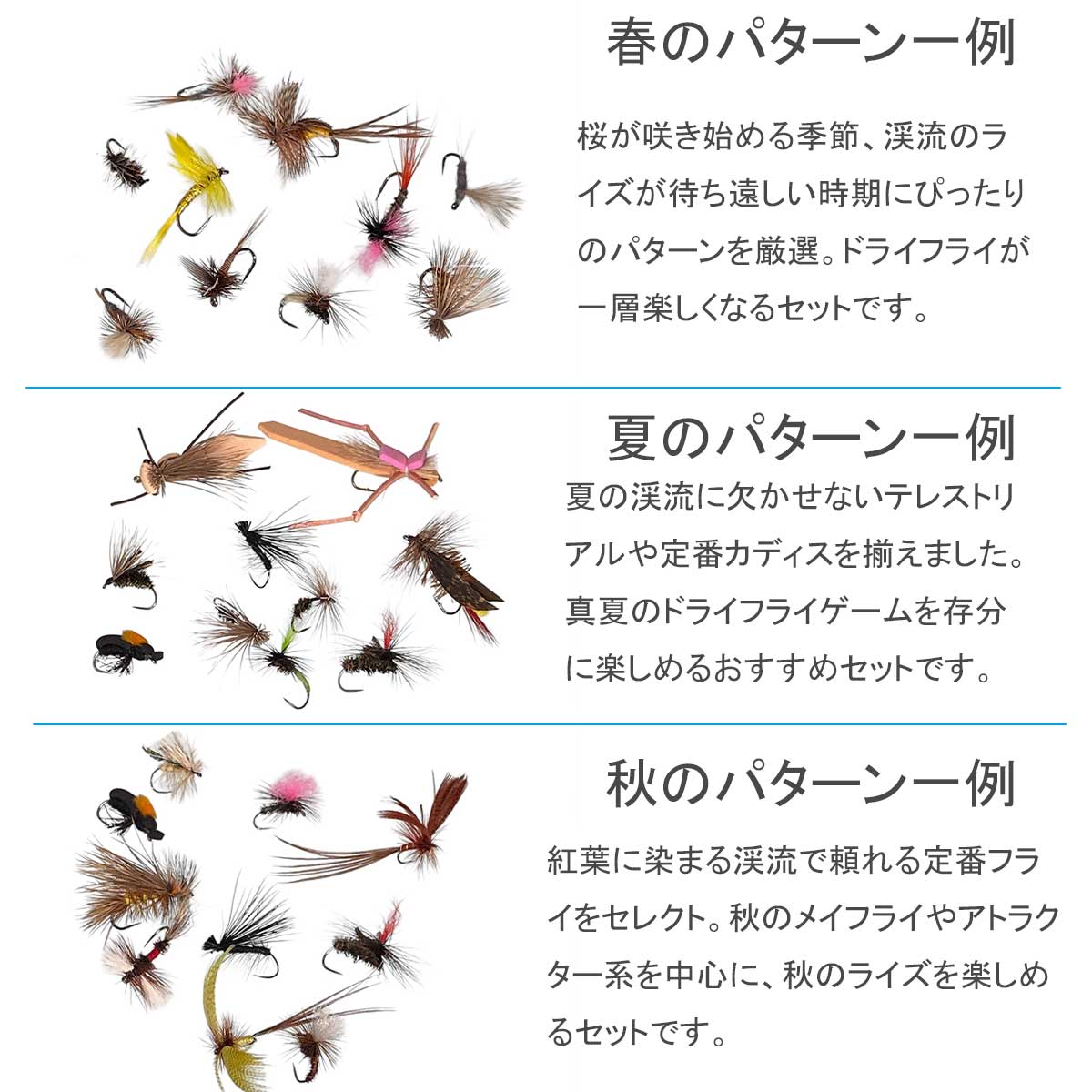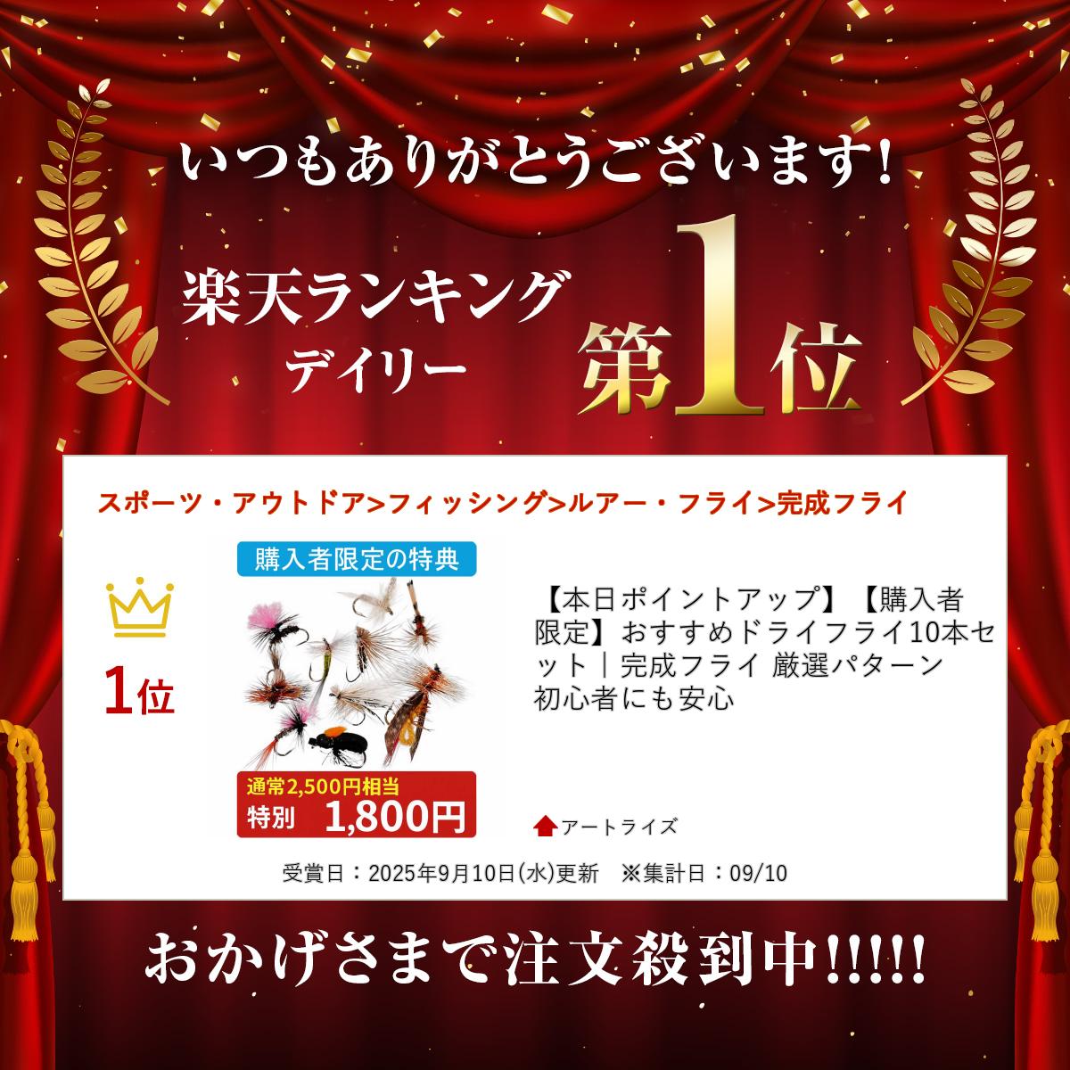おすすめドライフライ10本セット|購入者限定の特別商品 本商品は、完成フライを1,000円以上ご購入いただいた方だけにご用意している特別なドライフライセットです。単体でのご注文はできませんのでご注意ください。追加購入専用のため、誤って単品でご注文いただいた場合はキャンセル対応となります。 選ぶ手間がいらない安心のセット フライフィッシングを始めたばかりの方や、どのパターンを選んでよいか迷っている方におすすめ。アートライズが過去の釣果データや季節・地域の状況に基づいて厳選した実績フライを10本まとめました。初心者でも安心して使える内容です。 季節ごとの実績パターンを厳選 春は桜が咲く頃に活躍する定番パターン、夏はテレストリアル(アリ・ビートルなど)、秋は落ち着いたカラーのメイフライやアトラクターパターンなど、各シーズンに対応できる実績のあるフライをセレクトしています。写真は一例であり、実際にはその時期におすすめの内容をお届けします。 お得な特別価格 通常2,500円前後相当のフライを、購入者限定の特別価格1,800円でご提供。フライ選びに迷う時間を省きながら、お得に実績パターンを揃えることができます。 購入条件とご注意 完成フライを1,000円以上ご購入の方のみ追加可能です。 本セットのみでのご注文はできません。単品でご注文いただいた場合はキャンセルとなります。 内容は季節や釣果実績に基づいてセレクトします。パターンやサイズの指定はできません。 合計3,000円以上のご注文で、完成フライ1本プレゼントの特典も対象になります。おすすめドライフライ10本セット|購入者限定の特別商品 本商品は完成フライを1,000円以上ご購入いただいた方だけにご用意した追加専用セットです。 単体でのご注文はできませんのでご注意ください。誤って単品でご注文いただいた場合はキャンセルとなります。 選ぶ手間なしで安心 フライフィッシング初心者や入門者でも迷わず使える実績フライを厳選。過去の釣果データや季節・地域に合わせてセレクトされた10本セットです。 季節ごとのおすすめパターン 春は桜の季節に合う定番ドライフライ、夏はアリやビートルなどのテレストリアル、秋は渓流に強いマホガニーやオクトーバーカディスなどを例にご用意。写真は一例であり、その時期に最適な内容をお届けします。 お得な特別価格 通常2,500円相当を、購入者限定の特別価格1,800円でご提供。実績パターンをお得に揃えられるセットです。 購入条件と注意事項 ・完成フライを1,000円以上ご購入いただいた方のみ対象 ・本セット単体でのご注文はできません ・内容は釣果実績や季節に応じて変わります(指定は不可) ・合計3,000円以上のご注文でフライ1本プレゼントも対象