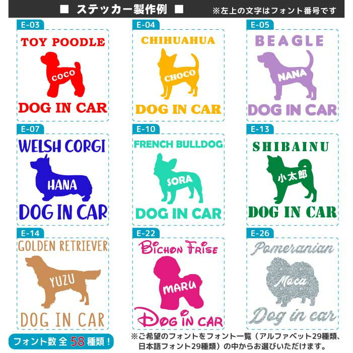 商品詳細商品名 カラー21色 121犬種犬 名前入れ 犬 ステッカー オーダー項目(※重要) 【1】ステッカーの色を21色の中からお選びください。【2】犬種シルエットを1A~121Cの中からお選びください。 【3】フォントをE-01〜29の中からお選びください。※お名前を漢字やかなにする場合はK-01〜29の中からお選びください。【4】シルエットの向きを「右向き」「左向き」からお選びください。 【5】ワンちゃんのお名前をご記入ください。 ※その他ご要望等ありましたら購入時備考欄へご記入ください。 サイズ こちらの商品はSサイズとなります。約 縦10cm×横10cm(Sサイズ) ※こちらの商品はこの他にも下記サイズも販売しております。Mサイズ(15cm×15cm)Lサイズ(20cm×20cm) カラー1 ホワイト(艶有り)2 ホワイト(艶無し) 3 ブラック(艶有り)4 ブラック(艶無し)5 ゴールデンイエロー(艶有り) 6 ブリムストンイエロー(艶有り)7 レッド(艶有り)8 パステルオレンジ(艶有り)9 バイオレット(艶有り)10 ライラック(艶有り)11 ピンク(艶有り) 12 ソフトピンク(艶有り)13 トラフィックブルー(艶有り)14 アイスブルー(艶有り) 15 ミント(艶有り)16 グラスグリーン(艶有り) 17 ライムツリーグリーン(艶有り)18 ライトブラウン(艶有り)19 クリーム(艶有り) 20 シルバー(艶有り)21 ゴールド(艶有り) 商品説明1・名前入り 犬 ステッカー・文字、絵柄のみ残る切り抜きタイプのカッティングステッカー・屋外耐候4~5年(防水)シート使用 ・到着後すぐにご使用いただる転写シート(和紙タイプまたは透明タイプ)付き ・貼り方の説明書、試し貼り用ステッカー同封(初めての方にも安心!)オススメ使用方法お車や店舗の入り口などに貼っていただいたり 文字を変更して玄関やポスト、インテリアとしてお好きな所へ貼っていただくのもおススメです♪(オススメの貼付け場所) ケージ、リード、エサ入れ、餌入れ、お皿、犬小屋、車、バイク、ヘルメット、自転車、リアガラス、ミラー、ボンネット、バンパー、ボディ、窓、キャリー、カート、ノートパソコン、タブレット、スマホ、携帯、扉、ドア、棚、キャビネット、ポスト、玄関、ウェルカムボード、表札 注意事項 ・貼る場所のサイズ、色をしっかりとご確認の上ご注文をお願い致します。 ・貼り付け前に油膜、汚れを十分除去してから貼り付けて下さい。 ・細かいパーツや尖った部分は、洗車時等剥がれやすい為ご注意下さい。 ・お車のフロントガラス、運転席・助手席のサイドガラスには貼れませんのでご注意ください。 ・ステッカーの色見本については、ご使用のモニター等の環境により実際のステッカーの色とは多少異なる場合がございますのでご了承ください。 備考●自社デザインで世界で1つだけの 犬ステッカー をお作りします。 ●自社製作でひとつひとつ丁寧にお作りしています。●サイズ変更や文字変更等にも対応いたしますのでお気軽にお問い合わせください! ●犬種、シルエット数も豊富にご用意しております。 犬 ステッカー は当店へおまかせください。犬種一覧 アイリッシュウルフハウンド / アイリッシュセッター / 秋田犬 / アフガンハウンド / アメリカンコッカースパニエル / アメリカンスタッフォードシャーテリア アメリカンピットブルテリア / アラスカンマラミュート / イタリアングレイハウンド / イングリッシュコッカースパニエル / イングリッシュスプリンガースパニエル / イングリッシュセッター / イングリッシュポインター / ウィペット / ウェルシュコーギー / ウェルシュテリア / ウエストハイランドホワイトテリア / エアデールテリア / オーストラリアンケルピー / オールドイングリッシュシープドッグ / 甲斐犬 / キースホンド / キャバリア / グレートデン / グレートピレニーズ / ケアーンテリア / ケリーブルーテリア / ゴールデンレトリバー / サモエド / サルーキー / シーズー / シェットランドシープドッグ / 柴犬 / シベリアンハスキー / シャーペイ / ジャーマンシェパード / ジャイアントシュナウザー / ジャックラッセルテリア / スコティッシュテリア / スタッフォードシャーブルテリア セントバーナード / ダックスフンド / ダルメシアン / チベタンスパニエル / チャウチャウ / チワワ / トイプードル / 土佐犬 / ドーベルマン / 日本スピッツ / ニューファンドランド / ノーフォークテリア / ノーリッチテリア / バーニーズマウンテンドッグ / バセットハウンド / バセンジー / パグ / パピヨン / ビーグル / ビションフリーゼ / フラットコーテッドレトリバー / フレンチブルドッグ / ブリアード / ブリタニースパニエル / ブリュッセルグリフォン / ブルテリア / ブルドッグ / プードル / プチバセットグリフォンバンデーン / ペキニーズ / ボーダーコリー / ボクサー / ボストンテリア / ボルゾイ / ポメラニアン / マルチーズ / マルックス / マンチェスターテリア / ミニチュアシュナウザー / ミニチュアダックスフンド / ミニチュアピンシャー / ヨークシャテリア / ラサアプソ / ラフコリー / ラブラド