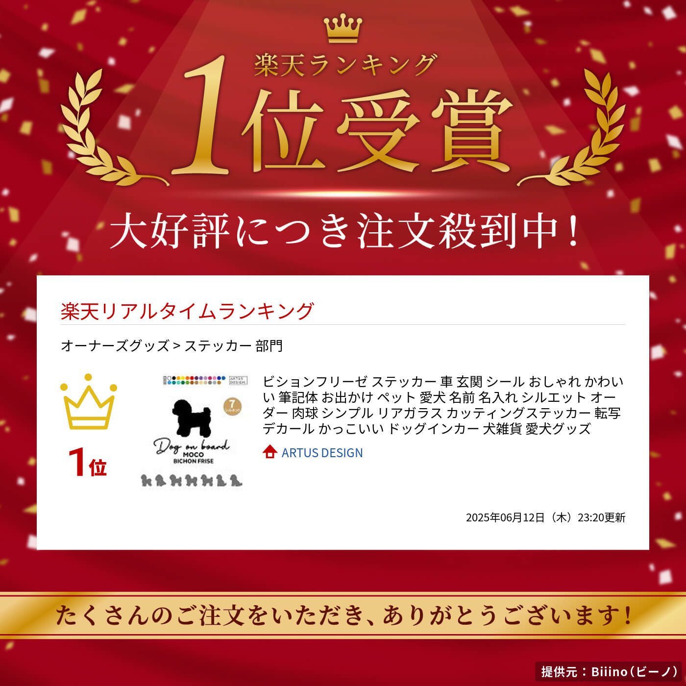 商品名ビションフリーゼ ステッカー 車 おしゃれ 名前 筆記体 名入れ シルエット オーダー シンプル 多頭 かわいい ペット リアガラス カッティングステッカー 転写 デカール シール かっこいい ドッグインカー 犬雑貨 愛犬グッズ アメリカン内容・ステッカー1枚 ・練習用肉球ステッカー ・貼り方説明書サイズSサイズ ヨコ12cm Mサイズ ヨコ15cm Lサイズ ヨコ20cm LLサイズ ヨコ25cm ※タテはお選びいただいたシルエットにより異なります特長・文字・絵柄のみ残るカッティングステッカー ・材質(ポリ塩化ビニールフィルム70ミクロン) ・屋外耐候シート(耐候年数5年程度) ・防水で色あせもない為長期使用可能 ・柔軟性があり穏やかな局面であれば貼り付け可能です。カラー全27色おすすめ ポイント当店オリジナル商品で、デザインから製作まで全てアルタスデザインで行っています。 ・初めての方でも簡単に貼り付けできるように、使用している材料や製作方法にも拘っています。 ・ご不明な点やご希望がありましたらお気軽にお問合せ下さい!注意事項・ステッカーを貼り付ける場所の油膜や汚れを十分に除去してから貼り付けしてください。 ・コンクリートや木材などザラザラした面にはご使用できません。 ・ステッカーを剥がす場合はステッカーリムーバー等ではがす事が出来ます。対応犬種アイリッシュウルフハウンド ウルフハウンド / アイリッシュセッター セター / 秋田犬 / アフガンハウンド / アメリカンコッカースパニエル アメコカ / アメリカンスタッフォードシャーテリア / アメリカンピットブルテリア ピットブル / アメリカンブリー / アラスカンマラミュート / イタリアングレイハウンド イタグレ / イングリッシュコッカースパニエル / イングリッシュスプリンガースパニエル / イングリッシュセッター / イングリッシュポインター ポインター / ウィペット / ウェルシュコーギー コーギー / コーイケルホンディエ / ウェルシュテリア / ウエストハイランドホワイトテリア ウエスティ ウェスティ / ウルフドッグ / エアデールテリア / オーストラリアンケルピー / オールドイングリッシュシープドッグ シープドッグ / 甲斐犬 / 紀州犬 / キースホンド / キャバリア / グレートデン / グレートピレニーズ ピレニーズ / ケアーンテリア / ケリーブルーテリア / ゴールデンレトリバー ゴル レトリバー / コモンドール / サモエド / サルーキー / シーズー / シェットランドシープドッグ / 四国犬 / 柴犬 豆しば マメシバ まめ柴 小豆柴 / シベリアンハスキー / シャーペイ / ジャーマンシェパード シェパード / ジャーマンピンシャー / ジャイアントシュナウザー / ジャックラッセルテリア / スキッパーキ / スコティッシュテリア スコッティ / スタッフォードシャーブルテリア / スムースコリー コリー / セントバーナード / ダックスフンド / ダルメシアン / チベタンスパニエル / チベタンテリア / チャイニーズクレステッドドッグ / チャウチャウ / 狆 / チワワ / ディアハウンド / トイプードル / 土佐犬 / ドーベルマン / 日本スピッツ スピッツ / 日本テリア / ニューファンドランド / ノーフォークテリア / ノーリッチテリア / バーニーズマウンテンドッグ バーニーズ マウンテンドッグ / バセットハウンド / バセンジー / パグ / ハバニーズ / パピヨン / ビアデッドコリー / ビーグル / ビションフリーゼ / フラットコーテッドレトリバー / フレンチブルドッグ フレブル / ブリアード / ブリタニースパニエル / ブリュッセルグリフォン / ブルテリア / ブルドッグ / プードル / プーリー / プチバセットグリフォンバンデーン / ペキニーズ / ボーダーコリー / ボーダーテリア / ボロニーズ / 北海道犬 / ボクサー / ボストンテリア / ボルゾイ / ポメラニアン / ホワイトシェパード / マスティフ / マルチーズ / マンチェスターテリア / ミニチュアシュナウザー ミニシュナ / ミニチュアダックスフンド / ミニチュアピンシャー / ヨークシャテリア ヨーキー / ラサアプソ / ラフコリー / ラブラドールレトリバー / レークランドテリア / レオンベルガー / ロットワイラー / ワイマラナー / マルプー / チワプー / チワックス / ポメチワ / チワマル / ポメプー / ダップー / マルックス / マルポメ / ペキプー / チワズ― / チワペキ / シュナプー / ビションプー / ヨーチワ / マルキー / キャバプー / マルシーズー / コッカプー / シープー / パピチワ / ヨープー / ゴールデン ドゥードゥル / ポメックス / ポメヨン / チワピン / マルパピ / ポメ柴 / シュナマル / ペキックス / チワパグ / ポメキー / マルビション / 柴チワ / キャバチワ / 柴プー / チワジャック / ピンプー / パピコー / チワブル / プーギー / 柴コギ / ポンスキー / ポメパグ / ウェスプー / コギックス / ビショックス / 柴ウザー / ビショペキビションフリーゼ ステッカー シール 名前 おしゃれ かわいい 筆記体ビションフリーゼ ステッカー 車 玄関 おしゃれ かわいい かっこいい 筆記体 ペット 愛犬 名前 名入れ 