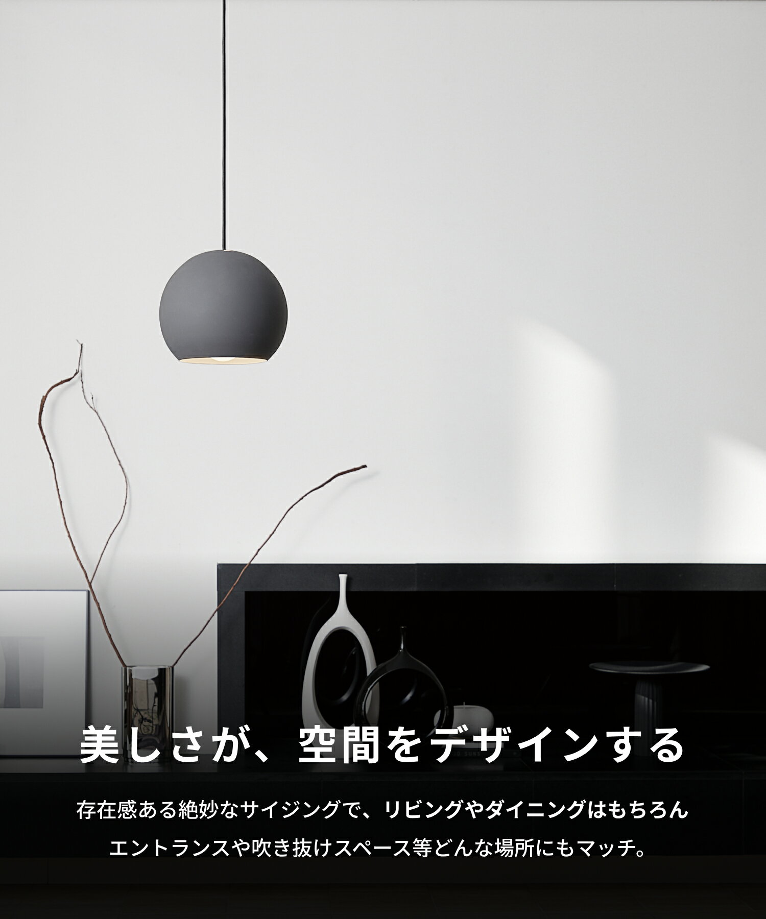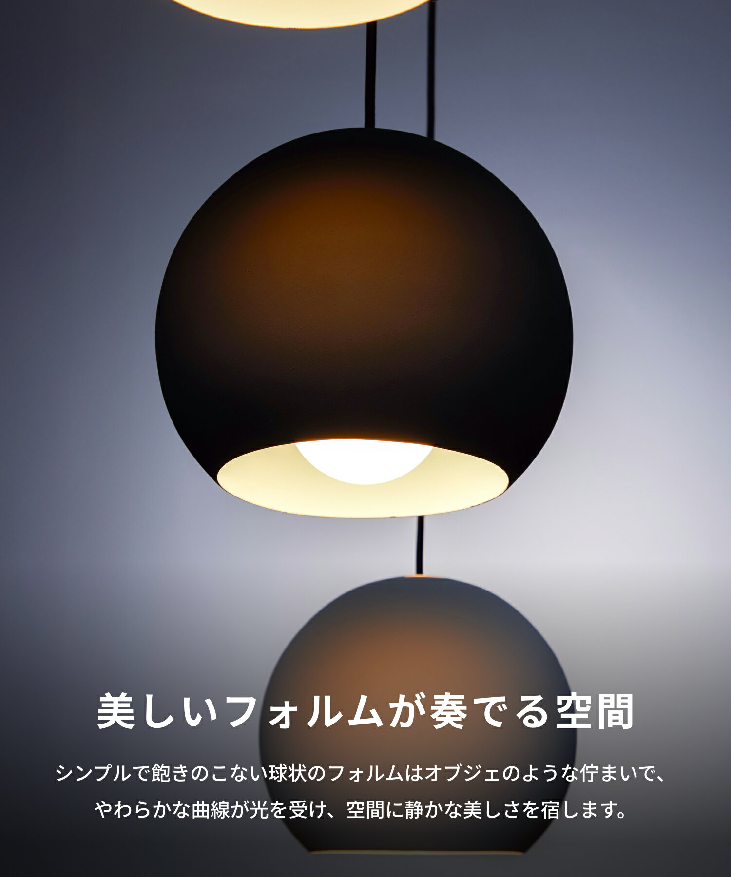 インテリア 北欧 おしゃれ ライト 照明 ボールライト 吊下げ灯 リビング ダイニング カフェ 店舗 照明器具 メタリック シンプル ブラック クローム ゴールド グレー ピンクゴールド ホワイトダイニングでのご使用をはじめ存在感ある絶妙なサイジングでリビングなどでもおすすめな「Session-dining pendant」。 複数組み合わせることで明るさの確保だけではなく、配置やデザインの組み合わせも楽しめます。シンプルで飽きの来ない球状のフォルムは、オブジェのような佇まいが魅力的でシリーズを通じてエントランスや吹き抜けスペース等どんな場所にもマッチするデザインです。 ゆったりと優しい気分になれるブラック、グレー、ホワイトのマットカラーとクローム、ゴールド、ピンクゴールドのミラーカラーの全6色をご用意しました。違うカラーを組み合わせると空間の彩りも楽しめます。 FEATURE 特長 01 美しさが、空間をデザインする 存在感ある絶妙なサイジングで、リビングやダイニングはもちろんエントランスや吹き抜けスペース等どんな場所にもマッチ。 02 美しいフォルムが奏でる空間 シンプルで飽きのこない球状のフォルムはオブジェのような佇まいで、やわらかな曲線が光を受け、空間に静かな美しさを宿します。 03 選べる、6つの上質なカラー ゆったりと優しい気分になれるブラック、グレー、ホワイトのマットカラーとクローム、ゴールド、ピンクゴールドのミラーカラーをご用意しました。 04 空間に合わせて、選べるサイズ 存在感ある絶妙なサイジングの「Session-dining pendant(現在のページ)」と小ぶりで多灯使いにもおすすめの「Session-pendant 1」をご用意しました。 05 灯りを重ねて、暮らしを彩る 1つでも絵になるペンダントライト。複数組み合わせることで明るさの確保だけではなく、配置やデザインの組み合わせも楽しめます。 STYLING この商品を使ったスタイリング #モダン #ベッドルーム グレーを基調としたベッドルームに、アクセントカラーとしてブラックを取り入れました。柔らかな光を放つペンダントライトが、優しくリラックスした雰囲気を演出し、就寝前に理想的な空間を提供しています。 RELATED ITEMS 関連アイテム Session-pendant 1 Session-pendant 6 Session-wall lamp Gelato-pendant SPEC サイズ・仕様 サイズ ページ上部の商品画像を横スクロールしてサイズ表の画像をご覧ください。 材質 スチール 重量 1.2kg 最大消費電力 100W スイッチ なし(壁面スイッチでON / OFF) 電球口金サイズ E26 取付方法 簡単取付(引掛シーリング) 付属品 取扱説明書 保証書 保証 本製品は安心の1年保証です。正常なお取り扱いで故障をされた場合、無償で対応させていただきます。 保証対応の際は「製品に付属の保証書」が必要となりますので大切に保管ください。 また、返品や交換につきましては、こちらをご確認ください。 備考 【 シーリングカバーの色 】 BK(ブラック)、GY(グレー)、WH(ホワイト):各シェードのカラーと同色 CH(クローム)、GD(ゴールド)、PG(ピンクゴールド):黒色 ※傾斜天井への取り付けはできません。天井に対して垂直にご使用いただく仕様となっております。傾斜のある天井や、傾斜を合わせた船底天井にお使いいただくと故障の原因になります。 キーワード インテリア 北欧 おしゃれ ライト 照明 ボールライト 吊下げ灯 リビング ダイニング カフェ 店舗 照明器具 メタリック シンプル ブラック クローム ゴールド グレー ピンクゴールド ホワイト