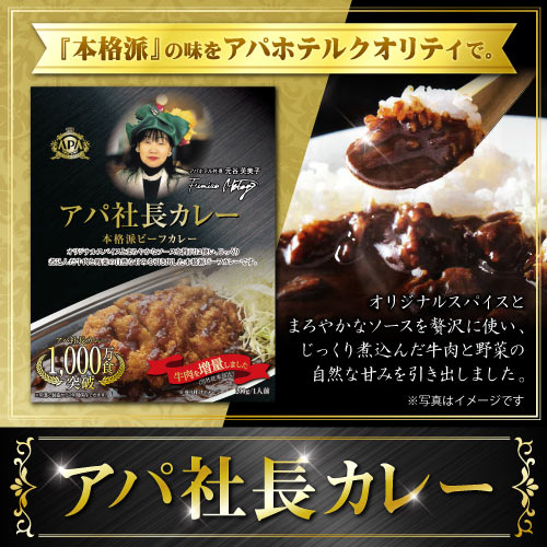 あのアパ社長の本格派ビーフカレーを、4個パックでお届け!話題騒然で参加賞・残念賞にもピッタリな、会場が盛り上がるまとめ買いセットです。オリジナルスパイスとまろやかなソースを贅沢に使ってじっくり煮込んだ、評判の高いこだわりの味わいをお楽しみいただけます。内容量:アパ社長カレー 4個(200g×4)賞味期限 :「発送日」から最低1ヶ月以上あるものを出荷させていただきますが、詳細なお日にちにつきましては、在庫の入荷日により異なります。配送方法:常温便注意事項 ※沖縄、離島は発送ができません。予めご了承ください。※現物でのお届け。パネル、目録はつきません。※ご注文数量によっては、出荷までに1週間程かかる場合がございます。※メーカーの都合によりパッケージ及び仕様が変わる場合がございます。※予告なく内容が変更となる場合があります。ご了承ください。