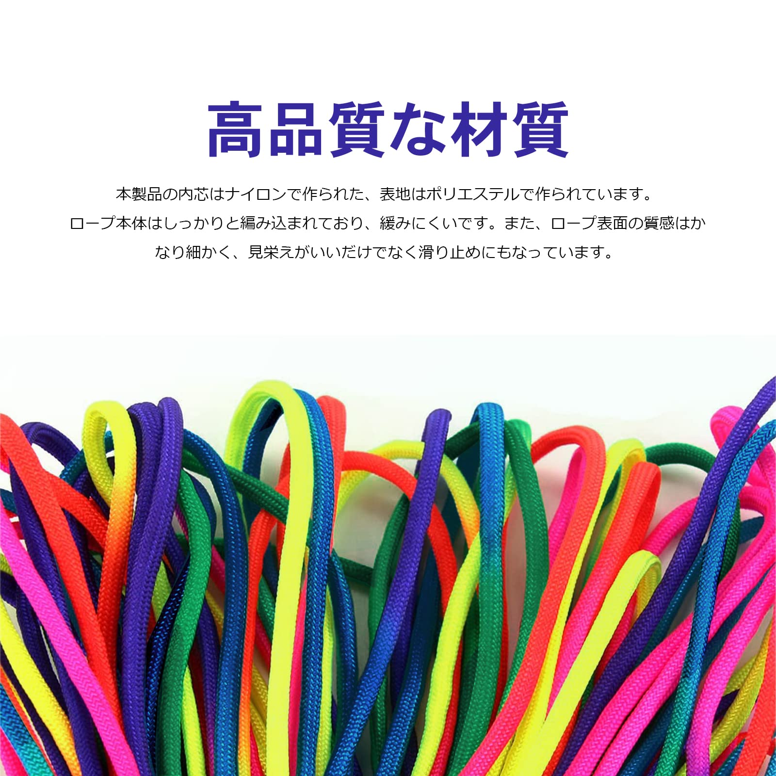 商品情報商品の説明主な仕様 【高品質な材質】 本製品の内芯はナイロンで作られた、表地はポリエステルで作られています。外皮と内芯に異なる素材を使用することで、耐摩耗性と引っ張り強度を増強して、ロープを頻繁に引っ張っても毛羽立ちやほつれが生じにくく、耐久性にも優れています。ロープ本体はしっかりと編み込まれており、緩みにくいです。また、ロープ表面の質感はかなり細かく、見栄えがいいだけでなく滑り止めにもなっています。br【耐摩耗性・軽量】 このカラフルなテントロープは内側の芯材は高強度のナイロンを採用され、強度と耐久性に優れています。ポリエステルの表地素材は肌触りが柔らかく、耐摩耗性にも優れています。カラフルロープは繰り返し使用しても色褪せず、切れにくく、丈夫で耐久性があります。また、1本約29-31メートルですが、重さはわずか約65gなので、軽量化を実現し、アウトドアや持ち運びに便利です。br【ご注意】 登山・命綱等でのご使用は絶対におやめ下さい。緊急時に重量を支える場合は、3〜4本束ねてお使い下さい。(あくまで、自己責任でのご使用をお願い致します。)ロープの先端はライター等で炙って、溶けて固まってからご使用ください。ロープに傷がついた場合は、直ちに使用を中止し、新しいものと交換してください。br【用途幅広い】 物干し、テント用、巻線ハンドルなどにはもちろん、子供のアクセサリーやブレスレット、手作りなどに使用する人が増えています。特にパラコードで編んだアクセサリーが人気です。例えば、ブレスレット、腕時計のストラップ、カメラのストラップ、携帯電話のストラップ、犬の首輪やリード、ハンドバッグ、キーホルダーなどを編んだものがあります。br【Mesanda安心サポート】 パッケージにダメージ(擦り傷・凹み・破れ等)がある場合、または品質に不具合がございましたら、メールでご連絡を頂けると迅速に対応致します。お問い合わせ方式ご案内いたします:「アカウントサービス」→「注文履歴」→「出品者に連絡する」
