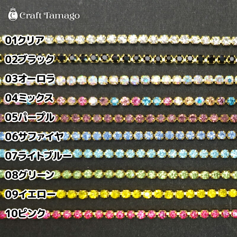 ■商品情報アクセサリー作りやデコレーションに大活躍のダイヤレーンが、たっぷり1m入りで登場!2mm幅のラインストーンが連なったゴールドベースのカップチェーンで、作品に上品な輝きをプラスします。切って使えるので、必要な長さに合わせて自由に加工が可能です。レジン封入やグルーデコ、衣装の装飾など用途いろいろ。 ※本商品は海外製のため、以下の点を良品の範囲として販売しております。あらかじめご了承のうえご注文ください。 ・ストーンのズレや外れ ・金属部分のバリや色ムラ ・接着のムラやわずかな歪み 【カラー(全10色)】 01クリア 02ブラック 03オーロラ 04ミックス 05パープル 06サファイヤ 07ライトブルー 08グリーン 09イエロー 10ピンク■サイズ幅:約2mm 長さ:約1m(ロール状ではなくカット品です)■入数1本■注意事項◎商品説明や注意事項をご確認の上ご購入をお願い致します。価格と品質の兼ね合いにより、多少の擦り傷、バリ、歪み、塗装ムラ、メッキムラ、色味の差など、ある程度は良品の範囲内とさせて頂いております。◎生産メーカーの都合により、再入荷時(ロット変更時)にサイズや色味、裏側等メインではない箇所のデザインが変更となる場合がございます。◎商品の色は撮影環境、モニター環境や設定、ブラウザにより実際と多少異なります。◎画像には使用例や撮影小物が含まれている場合がございます。◎当店の商品は手芸パーツ、雑貨です。 用途外のご使用はお控え頂き、お客様ご判断にて危険の無いようお取り扱いください。◎当店の画像・文章の無断使用はご遠慮ください。◎当店では、安心してお買い物をお楽しみいただけるよう商品情報の充実に努めております。ご不明な点がございましたらお気軽にお問い合わせください。◎ガラス製品は手作業生産の性質上、多少個体差がございます。完全な商品をお求めの方はご遠慮頂けますようお願い致します。また繊細な製品のため破損の恐れがございますのでお取り扱いには十分ご注意ください。※ネコポスは配送中の破損の補償はございませんので予めご理解ご了承の程お願い致します。◎シリコン型は消耗品です。使用回数を重ねる毎に劣化していきます。消耗具合は使用方法などにより異なりますので、ご自身でご判断ください。また材質上、小さなホコリ等が付着してしまっている場合がございますので、取り除いてからご使用ください。ご使用前に破損や不良箇所がないか必ずご確認ください。◎量り売り販売や切売り販売の商品について入数の大きい商品(入数が個数表記でも重量で個数を算出する場合がございます)は、入数や長さなど多少前後する場合がございます。また、欠けや変形のあるものが多少混入する場合がございます。予めご理解ご了承の程お願い致します。■商品検索キーワード訳あり ダイヤレーン ラインストーンチェーン カップチェーン 連爪 ゴールド 2mm 1m レジン封入 デコパーツ ハンドメイド 材料 ビジュー 海外製 パーツ