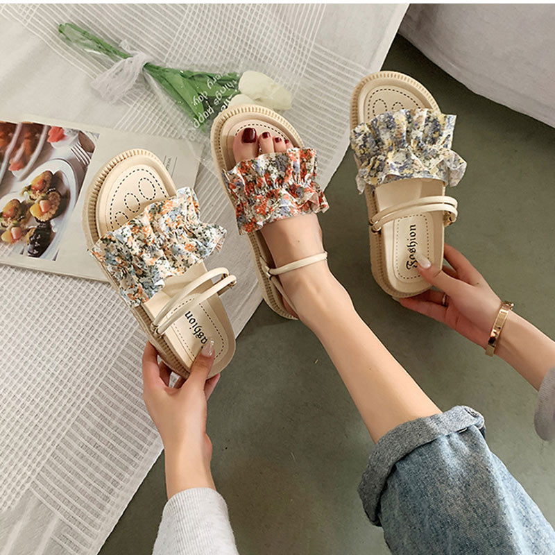 \ブラックフライデークーポンあり/スリッパサンダル レディース 2ways 花柄 フリル フレア ぺたんこ靴 履きやすい 歩きやすい 夏 カジュアルシューズ 痛くない アウトドア きれいめ おしゃれ 送料無料