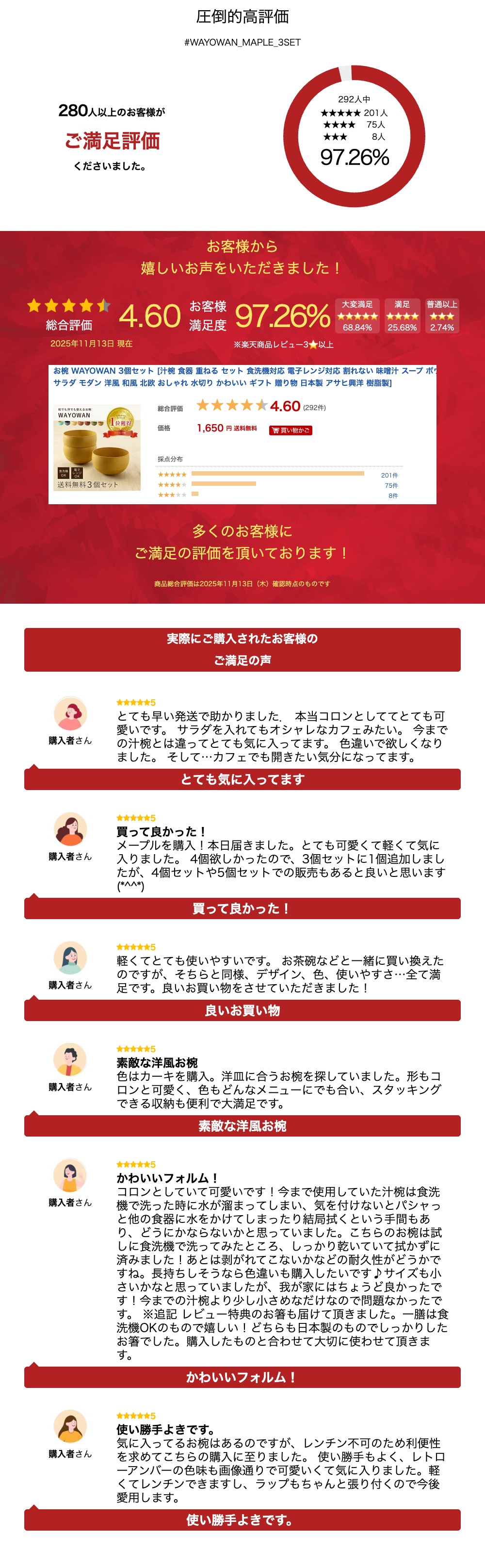 サイズ・小サイズ:φ10.1×5.8cm 約340ml(満水) ・中サイズ:φ11×6.4cm 約410ml(満水) ・大サイズ:φ12×7.1cm 約540ml(満水)素材表面塗装:ウレタン塗装 素地の材質:飽和ポリエステル樹脂カラー全7色 ・メープル ・カーキ ・朱 ・アカシア ・レトロアンバー ・ミント ・薄墨特徴大人気食器の[WAYOWAN]がまとめてお得な食器3個セット! 和食でも洋食でも家族みんなの手になじむうつわWAYOWAN ●様々なシーンで使い分けられる3サイズ。 ●和食でも洋食でも料理を選びません ●家族に優しい料理を選ばないオシャレなお椀 ●スープや味噌汁など様々な料理にピッタリ! ●スタッキング機能付きで重ねやすい ●持ちやすい丸形で手にフィットします ●樹脂製で落としても割れにくい! ●食器洗浄機・電子レンジ対応 ●耐熱温度:140℃ご注意点〇電子レンジ使用目安:600w/3分以内・1000w/1分以内 〇タワシ・みがき粉使用不可。 〇WAYOWAN全てが手塗りの為、商品によってムラや濃淡があります。 〇細かな傷が見られる場合がございます。 〇画像はイメージです。色味が異なって見える場合がございます。 〇一部地域につきましては送料無料対象外の場合がございます。総個数3個入り生産国日本製 福島県会津産メーカー名アサヒ興洋キーワードお椀 汁椀 椀 器 うつわ 茶碗 セット 食器セット お徳用 食器 樹脂製 割れない モダン モダン食器 軽量 スタッキング コンパクト 食器洗浄機対応 食洗対応電子レンジ対応 レンジ対応 送料無料 結婚祝い お祝い 父の日 母の日 敬老の日 お祝い返し ウェディングギフト ブライダルギフト バレンタインデー ホワイトデー 贈り物 引き出物 引出物 結婚 出産 命名 ギフト 贈答品 記念日 誕生日 クリスマス お正月 新学期 新生活 記念品 卒業記念品 お返し プレゼント お見舞い 引越し 入園 入学祝い 卒園祝い 卒業祝い 就職祝い 新築祝い 引越し祝い 結婚式 出産祝い 新築 引っ越し 引越し祝い 結婚記念日 粗品 年末年始 メープル アカシア 朱 カーキ レトロアンバー ミント グリーン 薄墨 グレー キッチン アサヒ興洋 アサヒコウヨウ あさひこうよう 関連商品お椀 そりわん 3個セット [うつわ 汁椀 洗浄椀 ボウル 食器 食洗...どんぶり 2個セット WAYOWAN すぐ [どんぶり 丼 食洗機対応...お椀 WAYOWAN [食器 お椀 電子レンジ対応 食洗器対応 耐熱 ...1,650円1,650円495円どんぶり 2個セット WAYOWAN [どんぶり 丼 食器 セット 食...茶碗 大平 2個セット WAYOWAN すぐ [茶わん 割れない 耐熱...プレート WAYOWAN [オーバルプレート 食器 食洗機対応 電子レ...1,870円1,430円1,320円プレート WAYOWAN 柿色 若実 [オーバルプレート 日本製 食器...どんぶり WAYOWAN 柿色 若実 [日本製 食洗機対応 レンジ 食...お椀 WAYOWAN 柿色 若実 中サイズ [日本製 食洗機対応 レン...1,320円770円495円お椀 WAYOWAN 柿色 熟柿 中サイズ [日本製 食洗機対応 レン...お椀 WAYOWAN 柿色 熟柿 大サイズ [日本製 食洗機対応 レン...食器 5点セット WAYOWAN [割れない 食器セット 食洗機対応 ...495円550円3,740円関連ワード: お椀 汁椀 スープボウル 味噌汁 鍋 スープ アサヒ興洋 食洗機対応 電子レンジ対応 割れない おしゃれ ギフト プレゼント 日本製 WAYOWAN 3個セット 食器セット かわいい 北欧 洋風 和風 スタッキング 樹脂製 コンパクト 耐熱 うつわ 茶碗 洗浄機 贈り物 軽量 手にフィット 器関連商品はこちら\30%OFF さらに最大300円OFFクーポン...\28時間限定 10%OFFクーポン! 20日ま...\28時間限定 10%OFFクーポン! 20時〜...《送料無料》 お椀 丼サイズ 2個セット ...茶碗 大平 2個セット WAYOWAN すぐ [茶...\28時間限定 10%OFFクーポン! 20時〜...