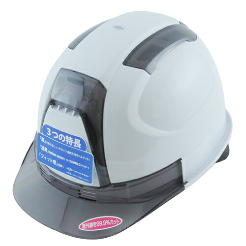 【用途】 飛来・落下物用・墜落時保護用保安帽。 【特徴】 通気性とフィット感アップを実現した高性能ヘルメットです。 建設・土木・工場、高所作業に最適です。 消臭素材を内装に使用しているのでいつでも快適に被れます。 ひさしにはキズが付きにくい特殊ハードコーティング加工が施してあり紫外線も99.9%カットします。 サイズ調整が簡単にできるOT型内装です。 【仕様】 ●サイズ:53〜62cm。 ●重量:約440g。 ●ひさし長さ:約40mm。 ●ひさし・パネル色:スモーク。 ●帽体色:白。 ●通気孔付き。 ●スチロールライナー入り。 【材質】 ●帽体:ABS樹脂。 ●ひさし・通気孔カバー:ポリカーボネート。 【注意事項・その他】