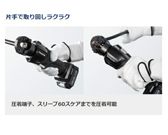 速く、美しく、プロの極意。 Panasonic電動工具は "EXENA"へ ミドルレンジをカバーするパワフルな軽量 コンパクトな「Lシリーズ」 EZ1W31F10S-B 小型軽量で使いやすい10.8V 2.0Ah電池1個付セット。 ■付属品 電池パック10.8V 2.0Ah EZ8L1020FA 急速充電器(リチウムイオン専用) EZ7L10A プラスチックケース EZ9K02 ※ケース用小箱は収納できません。 本体寸法/質量 全長329×全幅70×全高103mm/2.1kg ※電池パックEZ8L1020FA・60sqダイス装着時 コネクタ圧着能力(目安・フル充電で) CV線(14mm2)約470回 / CV線(22mm2)約280回 / CV線(38mm2)約230回 / CV線(60mm2)約160回 / 作業用品 電設工具 圧着工具 ぱなそにっく えぐぜな