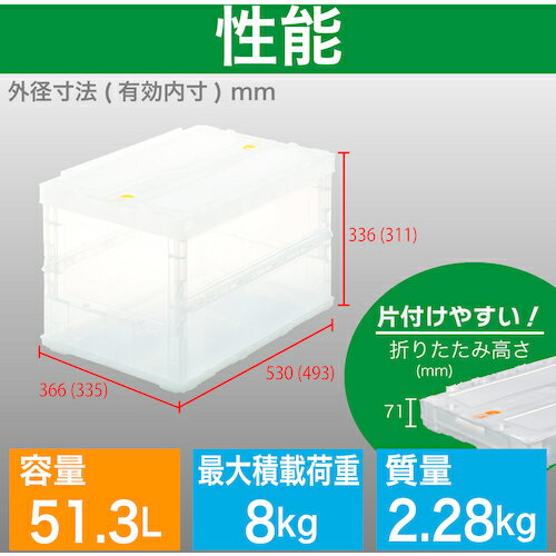物流・保管用品 コンテナ・パレットメーカー名トラスコ中山(株)プラス名称 TRUSCO商品名TRUSCO オリコン 薄型折りたたみコンテナ スケルコン 50L ロックフタ付 透明 透明型式TSKC50B TMメーカー希望小売価格【税抜】2580円(税抜)オレンジブック2025年 100791ページ発注コード344-9467JANコード4989999017793特長●中が透けて見えるため、コンテナの中身が判別しやすく、保管・管理に最適です。●折りたたんだ時の高さを最大限まで追求、従来タイプに比べて最大35%低く、これにより輸送運賃・保管スペースを大幅に削減することができます。●組み立て時も、折りたたみ時にも積み重ねができ荷崩れの心配がありません。用途●商品や部品・備品の配送および保管・管理。●内容物の種類・大きさが一定でない荷物の配送に最適。仕様●容量(L):51.3●色:透明●外形寸法(mm)間口:530●外形寸法(mm)奥行:366●外形寸法(mm)高さ:336●有効内寸(mm)間口:493●有効内寸(mm)奥行:335●有効内寸(mm)高さ:311●折りたたみ高さ(mm):71●最大積載荷重(kg):8●食品衛生法適合(ポジティブリスト適合)●スライドロックフタ付材質●ポリプロピレン(PP)セット内容/付属品注意●提供不可:ミルシート原産国日本重量2280G納期目安当日〜2営業日以内に発送 ※欠品時別途連絡