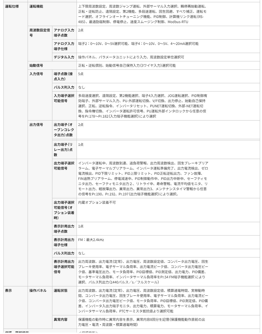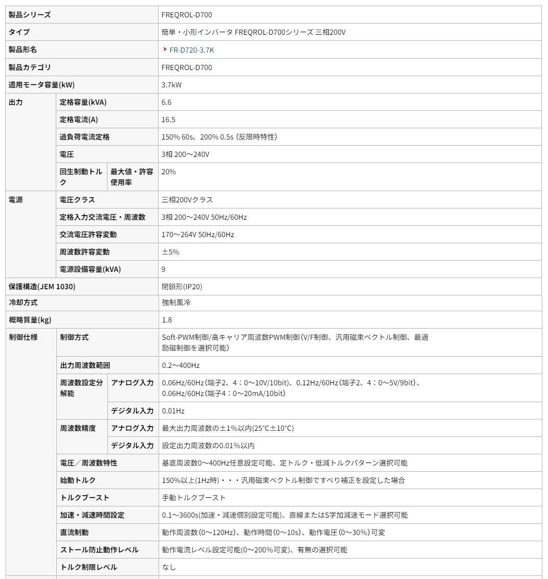 特長 汎用磁束ベクトル制御により 150%/1Hz、200%/3Hz(3.7K以下)高始動トルクを実現しました。 信頼性・保全性の向上に加え、簡単操作・性能を更に追及しました。 用途 三相誘導電動機の回転数を簡単自由に変えることのできる可変周波数電源装置。 仕様・規格 出力定格電源:三相200〜240V モーター容量(kW):3.7 出力容量(kVA):6.6 出力電流(A):16.5 幅(mm):170 奥行(mm):142.5 高さ(mm):128 入力電圧(V):200〜240 質量・質量単位:1.8kg 三菱インバータの新基準 スプリングクランプ端子(制御回路)により高い信頼性と簡単配線を実現しました。 セーフティストップ機能を装備、ハードウェアによる遮断回路により 信頼性の高い緊急出力遮断が行えます。 コンパクトボディにクラス最高水準の性能を搭載 当社最小インバータであるFREQROL-S500シリーズと同一取付け寸法の コンパクトボディ(3.7K以下)に、汎用磁束ベクトル制御を搭載 1Hz時150%(3.7K以下)の高トルクを実現しました。 充実の機能 ファン・ポンプ用途に最適励磁制御・PID制御、工作機械用途に 停電時減速停止機能、搬送・食品用途に汎用磁束ベクトル制御・ ブレーキ抵抗器接続(0.4K〜15K)等用途に応じた様々な機能を搭載しました。