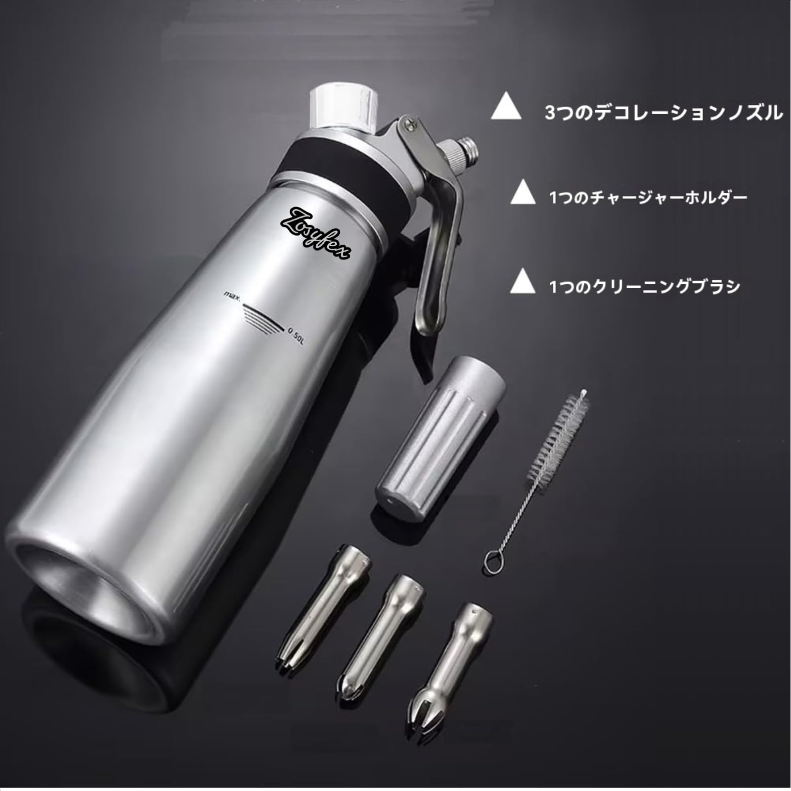 生クリームディスペンサー 泡立て器 アルミ合金製 ハンドミキサー デザートツール クリームホイッパー 3種口金付き 家庭用 業務用 CO2カートリッジ対応 お菓子作り用 洗浄ブラシ付き ギフトにも最適