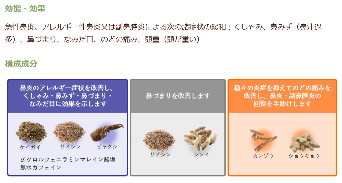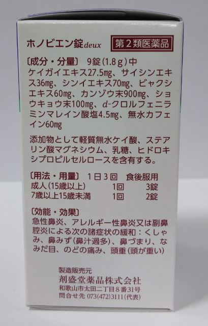 剤盛堂薬品・ホノミ漢方薬 ホノビエン錠deux 口が渇きにくい 花粉症・アレルギー性鼻炎の改善薬 ホノビエン錠deuxは、アレルギー性鼻炎・急性鼻炎などにおける くしゃみ・鼻みず・鼻づまりなどのつらい症状に働くよう考えられた生薬配合の鼻炎用内服薬です。 薬と養生 ホノビエン錠deuxは、生薬の特性を活かした生薬配合製剤ですので、あなたの体質や病状を 考えて正しく服用することが大切です。 また、気持ちの持ち方(気の養生)や食生活(食の養生)に注意することも病気を治すために は大事な事です。 ホノビエン錠deuxの働き d-クロルフェニラミンマレイン酸塩を中心に、ケイガイ・サンシン・ビャクシなど鼻炎のアレル ギー症状を改善し、くしゃみ・鼻水・鼻づまり・なみだ目に効果を示します。 サイシン・シンイは鼻づまりを改善するよう働き、カンゾウは種々の炎症を抑えてのどの痛み を改善し、ショウキョウとともに鼻炎・副鼻腔炎の回復を手助けします。 ホノビエン錠deuxの成分・分量 本剤9錠(1.8g)中 ケイガイエキス:27.5mg、サイシンエキス:36mg、シンイエキス:70mg、ビャクシエキス:60mg、 カンゾウ末:900mg、ショウキョウ末:100mg、d-クロルフェニラミンマレイン酸塩:4.5mg、 無水カフェイン:600mg 添加物として軽質無水ケイ酸、ステアリン酸マグネシウム、乳糖、ヒドロキシプロピルセルロ ースを含有する。 ●本剤は天然の生薬を原料としていますので内容物の色調は多少異なることがありますが 効果に変わりはありません。 ホノビエン錠deuxの効能効果 急性鼻炎、アレルギー性鼻炎又は副鼻腔炎による次の諸症状の緩和: くしゃみ、鼻みず(鼻汁過多)、鼻づまり、なみだ目、のどの痛み、頭重(頭が重い) ホノビエン錠deuxの用法・用量 次の量を、コップ半分以上のぬるま湯にて服用して下さい。 年齢 1回量 1日服用回数 大人(15歳以上) 3錠 3回 7歳以上15歳未満 2錠 3回 7歳未満 服用しないこと 用法・用量に関連する注意 (1)用法・用量を厳守すること ホノビエン錠deuxの注意事項 (1)用法・用量を厳守すること。 保管及び取扱い上の注意(1)直射日光の当たらない湿気の少ない涼しい所に保管すること。 (2)小児の手の届かない所に保管すること。 (3)他の容器に入れ替えないこと。(誤用の原因になったり品質が変わる。) 品 名 ホノビエン錠deux 内容量 300錠 賞味期限 ホノビエン錠deuxにつきましたは1年未満の商品は販売いたしません。 保存方法 直射日光、高温・多湿の場所を避けて保存してください。 登録販売者 山田 秀文(ヤマダヒデフミ) 広告文責 有限会社 横川ヤマト TEL 0982-295-1732 メーカー 剤盛堂薬品株式会社 製造国・区分 日本・第2類医薬品 JANコード 4987474165311 <購入時の注意事項> 予告無くパッケージが変更にある場合がありますので予めご了承下さい。 製造・取扱い中止の場合にはキャンセル処理をさせて頂く場合がございます。 おすすめする鼻病の養生法 <原因を排除または遠ざける> ○ハウスダストが高原の場合 こまめに家の中のほこりをぬれ雑巾で拭くようにしましょう。 ○花粉が高原の場合 なるべく家の中に持ち込まないように、外出がら帰ったら玄関で衣類を良く 払いましょう。 <身体を鍛える> ○風を引かないように 風邪をひいた場合は無理をするとかえって悪化することもあるので、まずは安静にして おきましょう。 ○血行改善を 軽い運動などで血の循環をよくすることは鼻の苦情の改善にもつながります。 <バランスのとれた食生活を> 子供が好む甘いお菓子や冷たいジュースの取り過ぎ、お酒をのみながらの肉類などの 脂っこい食事は控えましょう。また、加工食品やインスタント食品の取り過ぎは、アレル ギーを起こしやすい体質を作ることにもつながります。 <ストレス解消で落ち着いた毎日を> イライラやストレスで精神不安定な状態では、病気を改善する意欲も湧いてこないもの。 鼻の病気の原因には、自律神経のバランスの乱れも関係してきます。 落ち着いた気持ちで過ごせるように趣味を充実させるなど気分転換の場を作りましょう。【医薬品】 あなたのお悩みを症状で探す更年期でお悩みの方アレルギー性鼻炎の方残尿感でお困りの方お休み時の激しいせきにアレルギー体質の方痔でお悩みの方胃腸障害でお悩みの方頭痛めまいでお悩みの方疲れやすい方に蓄膿症でお困りの方乳腺炎でお悩みの方不眠症でお悩みの方血圧が高めの方頑固な便秘でお困りの方神経痛・関節痛に排尿痛でお困りの方ストレスでお悩みの方むくみでお悩みの方月経不順の方眼精疾患でお悩みの方肝臓疾患でお悩みの方中耳炎でお困りの方歯槽膿漏でお悩みの方腎臓疾患でお悩みの方手足のしびれお悩みの方 ホノビエン錠 deuxは、口が乾きにくいアレルギー性鼻炎の改善薬 花粉症・アレルギー性鼻炎にホノビエン錠 deuxです。