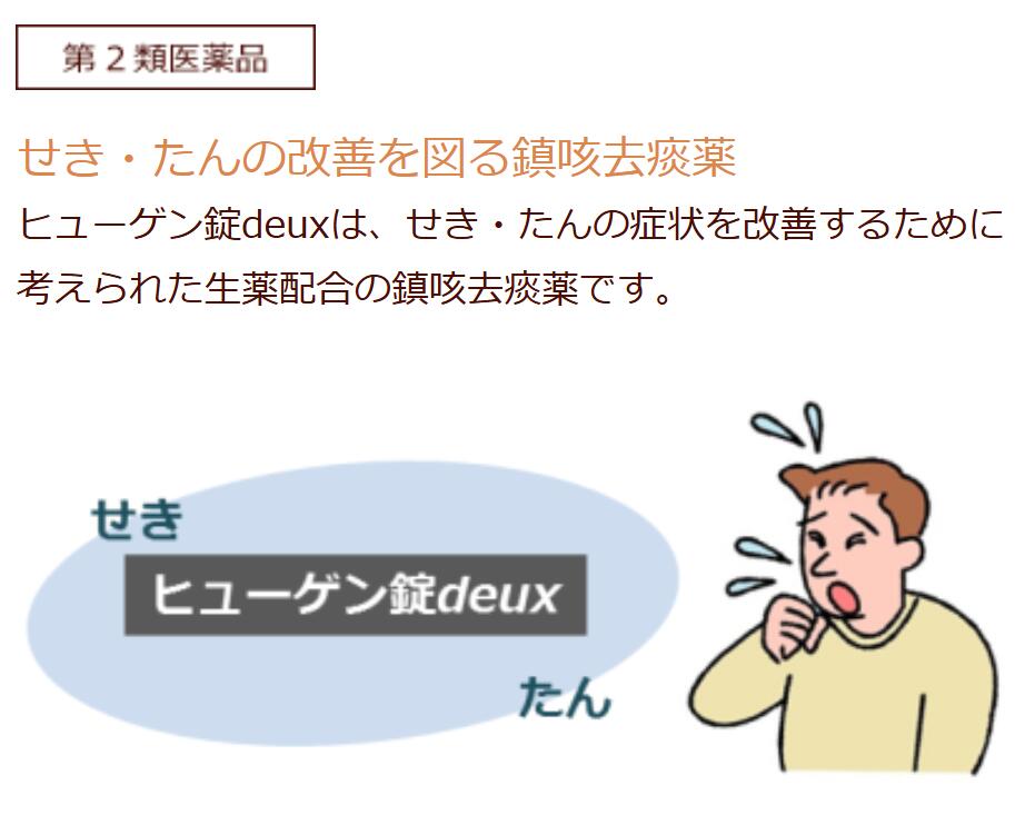 ヒューゲン錠<第2類医薬品> せき・たんにヒューゲン錠 ヒューゲン錠は、現代人を悩ませる「せき」 慢性病の中でも、代表選手ともいえる「せき」 慢性病だからと諦めないで下さい。 のどや気管の弱い体質の人は、せき・痰を伴う諸症状で悩まされることが多いものです。 咳・たんの苦情、気管・粘膜のアレルギー症状を改善する為に考えられた生薬配合の鎮咳去痰薬です。 ヒューゲン錠の構成成分(18錠(3.6g)中)キョウニンエキス 40mg、ゴミシエキス 50mg、サイシンエキス 45mg、シャゼンシエキス 25mg、ソヨウエキス 100mg、チンピエキス 450mg、ハンゲエキス 50mg、カロニンエキス 25mg、カンゾウ末 900mg 添加物としてステアリン酸マグネシウム、乳糖、バレイションデンプン、ヒドロキシプロピルセルロース、メタケイ酸アルミン酸マグネシウムを含有する。 このように剤盛堂「ホノミ漢方」ヒューゲン錠中の生薬が互いに関連し合って内臓にかかる負担をすくなくし、せき・たんの症状を改善する働きがあります。 ヒューゲン錠の効能効果:せき・たん ヒューゲン錠の服用方法 大人 1回6錠、11歳以上15歳未満 1回4錠8歳以上11歳未満 1回3錠5歳以上8歳未満 1回2錠15歳未満の小児服用の際には必ず保護者の指導監督下に服用させて下さい。 品 名:ヒューゲン錠 内容量:450錠 使用期限:ヒューゲン錠は1年未満の商品は販売いたしません。 広告文責:有限会社 横川ヤマト登録販売者:山田 秀文 TEL:082-295-1732メーカー:剤盛堂株式会社 製造国・区分:日本・第2類医薬品 JANコード:497474143395【医薬品】 あなたのお悩みを症状で探す更年期でお悩みの方アレルギー性鼻炎の方残尿感でお困りの方お休み時の激しいせきにアレルギー体質の方痔でお悩みの方胃腸障害でお悩みの方頭痛めまいでお悩みの方疲れやすい方に蓄膿症でお困りの方乳腺炎でお悩みの方不眠症でお悩みの方血圧が高めの方頑固な便秘でお困りの方神経痛・関節痛に排尿痛でお困りの方ストレスでお悩みの方むくみでお悩みの方月経不順の方眼精疾患でお悩みの方肝臓疾患でお悩みの方中耳炎でお困りの方歯槽膿漏でお悩みの方腎臓疾患でお悩みの方手足のしびれお悩みの方
