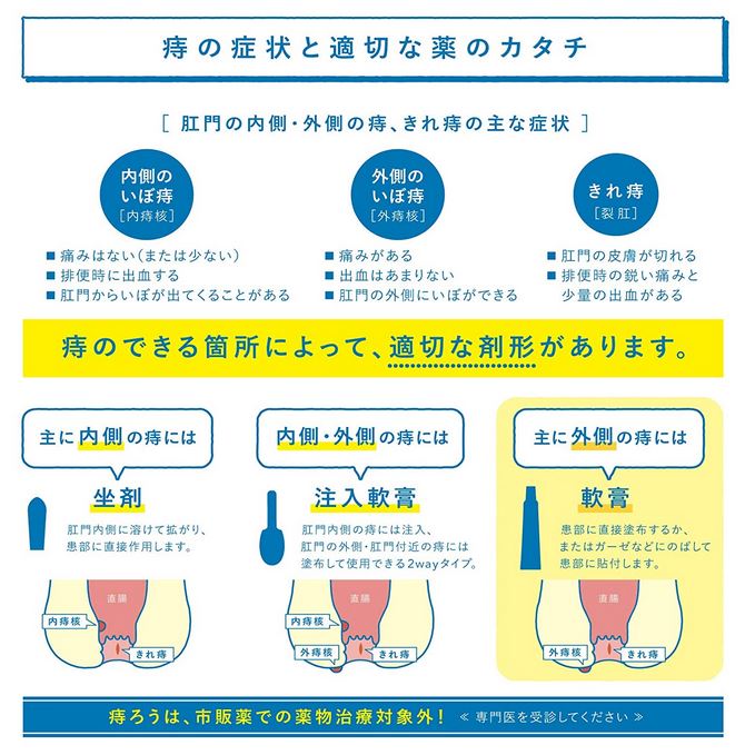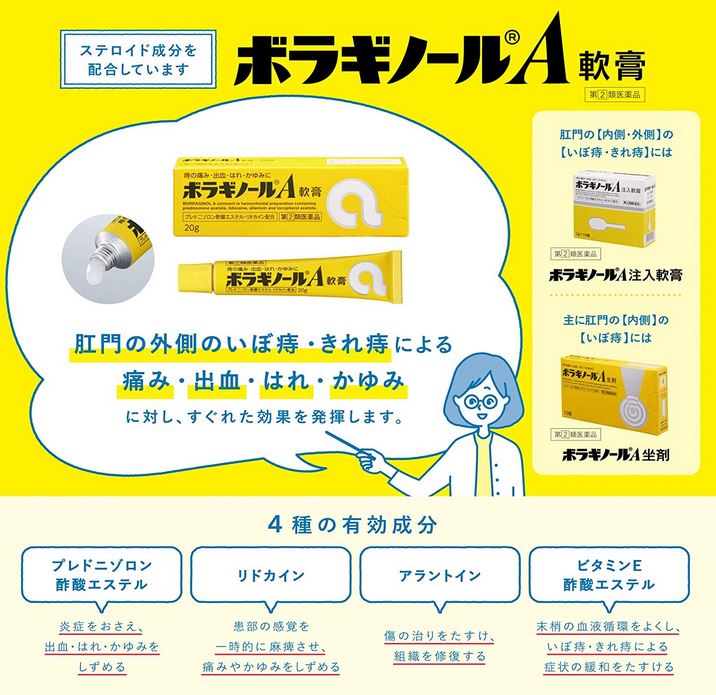 ≪第(2)類医薬品≫ 主に肛門の外側・肛門付近の痔に “ボラギノールA軟膏” ≪ボラギノールAの特徴1≫4種の有効成分のすぐれた効果 4種の有効成分が痔による痛み・出血・はれ・かゆみにすぐれた効果を発揮します。 ●4種の有効成分のはたらき 1)炎症をしずめる プレドニゾロン酢酸エステル ステロイド性抗炎症成分で、炎症をおさえ、出血・はれ・かゆみをしずめます。 ●痛みやかゆみをしずめる リドカイン 局所麻酔成分で、患部の感覚を一時的に麻痺させ、痛みやかゆみをしずめます。 ●傷の治りをたすける アラントイン 傷の治りをたすけ、組織を修復します。 ●うっ血の改善をたすける ビタミンE酢酸エステル(トコフェロール酢酸エステル) 末梢の血液循環をよくし、うっ血の改善をたすけます。 ※ステロイド外用薬の使用に対して不安を感じていらっしゃる方へ ボラギノールAシリーズに配合されているステロイド成分(プレドニゾロン酢酸エステル)は、 体内で作られる副腎皮質ホルモンを化学的に合成した成分です。 ステロイド外用薬の中で効力の弱いランクに分類されており、適正に使用すれば、過剰に 心配する必要はないとされています。 ≪ボラギノールの特徴2≫使いやすさを考えた軟膏タイプ ●なめらかですべりのよい油脂性基剤を使用しています 刺激が少なく、油脂性基剤が傷ついた患部を保護します。 白色?わずかに黄みをおびた白色の軟膏です。 ≪ボラギノールの効能効果≫ ●ボラギノールは、いずれも15歳以上の方が対象です。 いぼ痔・きれ痔(さけ痔)の痛み・出血・はれ・かゆみの緩和 ≪ボラギノールの用法・用量≫ 次の量を患部に直接塗布するか、またはガーゼなどにのばして患部に貼付すること。 年 齢 1回量 1日使用回数 成人(15歳以上) 適量 1?3回 15歳未満 使用しないこと (1)肛門部にのみ使用すること。 (2)用法・用量を厳守すること。 ≪ボラギノールの成分/1g中≫ 成分及び含量 はたらき プレドニゾロン酢酸エステル…0.5mg 炎症をおさえ、出血、はれ、かゆみをしずめます。 リドカイン…30mg 局所の痛み、かゆみをしずめます。 アラントイン…10mg 傷の治りをたすけ、組織を修復します。 ビタミンE酢酸エステル(トコフェロール酢酸エステル)…25mg 末梢の血液循環をよくし、うっ血の改善をたすけます。 添加物:白色ワセリン、中鎖脂肪酸トリグリセリド、モノステアリン酸グリセリン ※この医薬品は、薬剤師、登録販売者に相談のうえ、『使用上の注意』をよく読んでお使いください。 ≪保管及び取扱い上の注意≫ (1)直射日光の当たらない湿気の少ない涼しい所に密栓して保管すること。(2)小児の手の届かない所に保管すること。(3)他の容器に入れ替えないこと(誤用の原因になったり品質が変わる)。(4)使用期限の過ぎた製品は使用しないこと。 名 称 ボラギノール軟膏 内容量 20g 賞味期限 1年未満の商品は販売いたしません。 保存方法 直射日光、高温・多湿の場所を避けて保存してください。 登録販売者 山田 秀文(ヤマダヒデフミ) 広告文責 有限会社 横川ヤマト TEL 0982-295-1732 メーカー 天藤製薬株式会社 製造国・区分 日本・第(2)類医薬品 JANコード 4987978101037 副作用被害救済制度の問い合わせ先 (独)医薬品医療機器総合機構 (フリーダイヤル)0120-149-931 <購入時の注意事項> 予告無くパッケージが変更にある場合がありますので予めご了承下さい。 製造・取扱い中止の場合にはキャンセル処理をさせて頂く場合がございます。【医薬品】 あなたのお悩みを症状で探す更年期でお悩みの方アレルギー性鼻炎の方残尿感でお困りの方お休み時の激しいせきにアレルギー体質の方痔でお悩みの方胃腸障害でお悩みの方頭痛めまいでお悩みの方疲れやすい方に蓄膿症でお困りの方乳腺炎でお悩みの方不眠症でお悩みの方血圧が高めの方頑固な便秘でお困りの方神経痛・関節痛に排尿痛でお困りの方ストレスでお悩みの方むくみでお悩みの方月経不順の方眼精疾患でお悩みの方肝臓疾患でお悩みの方中耳炎でお困りの方歯槽膿漏でお悩みの方腎臓疾患でお悩みの方手足のしびれお悩みの方