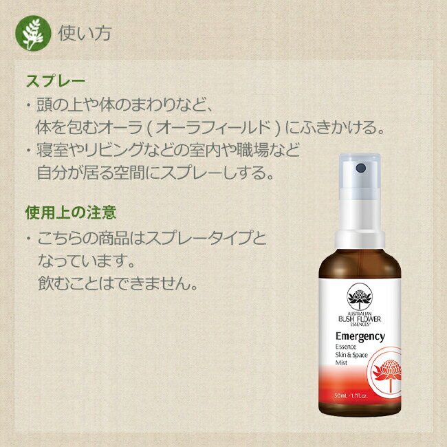 メーカー名 BushBiotherapiesPtyLtd, シリーズ名 オーストラリアンブッシュ 商品名 フォーカススプレー(Focus Spray)(集中力) 原材料/品質 水・ブランデー・エッセンシャルオイル・フラワーエッセンス 内容量 50ml 賞味期限 パッケージに記載 製造者 BushBiotherapiesPtyLtd, 生産国 オーストラリア 輸入者 ネイチャーワールド(株) 資料提供 ネイチャーワールド(株) 使用上の注意 ラベルのデザインが変更になる場合がございます。予めご了承ください。 本品は化粧品や医薬品ではありません。 効果は個人によって異なり、特定の効果を保証するというものではありません。 広告文責 ネイチャーワールド(株)(0364584550) キーワード Focus Spray Q:フラワーエッセンスって何? フラワーエッセンスは、花が持つ癒しを「エッセンス」というかたちで取り込む自然療法です。花や草木を育てたり触れたりすることによって「癒されたなぁ」と感じたことがある方もいるるのではないでしょうか。その「癒しエネルギー」を水に転写したものをフラワーエッセンスといいます。特に「癒し」が強かった「花」を中心に、動物や鉱石、自然環境などの様々な自然界の「癒しエネルギー」からフラワーエッセンスが作られています。フラワーエッセンスは欧米では日常レベルで根付いており、レスキュー隊などの常備品として使われていたり、薬局で売られていたりしています。 Q:フラワーエッセンスはいつから使われてるの? 1936年にイギリスの高名な医師エドワード=バッチ博士により新しい療法として「フラワーエッセンス」は生み出されました。細菌学者であり病理学者でもあったバッチ博士は、患者の訴えに耳を傾けるうちに、従来の診断法・治療法に限界を感じ、「すべての病気を癒す方法」を模索するようになります。野生の植物に心や感情を癒す力に注目し、長い年月をかけ始まりの38種類からなる現在バッチフラワーレメディーと呼ばれるフラワーエッセンスを完成させました。 Q:フラワーエッセンスとアロマの違いは何? 「フラワーエッセンス」という名前から花のエキスを抽出し、香りや色がついていると思う方が多いかもしれませんが、花の香りや色、味などは入っておりません。 アロマオイルは植物の「香りなどの成分」を抽出し芳香を楽しむものに対し、フラワーエッセンスは「癒しのエネルギー」を水に転写したものになります。 Q:誰でも使えるの? フラワーエッセンスは他の薬や治療法と併用してお使いできます。アロマテラピーなどで使用する精油などには、妊婦や小さいお子様に使えない種類などがありますが、フラワーエッセンスにはありません。性別や年齢関問わず、小さなお子様からお年寄りまで全ての方、またペットまでお使いいただけます。オーストラリアンブッシュ スプレー フォーカススプレー(Focus Spray)(集中力) アイデアを消化吸収する、明晰さ、集中力 スプレー オーストラリアン・ブッシュ・フラワーエッセンスのスプレーは、純粋な植物・ハーブのエキス、上質なアロマ・オイルが加えられ、ポジティブな癒しの空間を作り出していただけるように配合されました。水分補給・保湿・ポジティブな環境作りの深い癒しの効果をもつこのベース液に、ブッシュ・フラワーエッセンスがブレンドされ、あなたの感情面を優しく・しかし深いところから癒してくれます。これらのスプレーは、ご自宅・職場・旅行中、あるいは大切な方に対して、安全な癒しの空間が必要な時にはいつでもお使いいただけます。 アイデアを消化吸収する、明晰さ、集中力 ■マイナス 白昼夢・ぼんやりとした状態、注意散漫、圧倒されたような感覚 ■プラス アイデアを消化吸収する、明晰さ、集中力 このスプレーには、フォーカスエッセンスと、純粋なエッセンシャルオイルが贅沢に使用されています。 オーラの周りにスプレーすることで、明晰さや集中力を高めてくれるでしょう。また、ご自分の環境に用いることで、集中力が高まり、アイデアや情報の統合が促進されるでしょう。 仕事、会話、読書、勉強の際に、明晰さと集中力をもたらしてくれます。直感と認知プロセスのバランスをとり、アイデアや情報の統合を助けてくれます。集中を必要とする学習や活動のサポートに最適です。過去からの知識や経験のすべてが保存されている『ハイヤーセルフ』へのアクセスを向上させ、問題解決をサポートします。 ベルガモット、サイプレス、レモンマートル、フランキンセンス、ローズマリーのエッセンシャルオイルが入っています。フォーカスエッセンスを象徴する、気持ちが高揚するような、グリーンを感じさせるピリッとした香りです。 ■入っているエッセンス:ブッシュフューシャ、アイソポゴン、ジャカランダ、ポーポー、サンデュー ■香り:ベルガモット、サイプレス、レモンマートル、フランキンセンス、ローズマリー 成分表 成分名 こんな時に…。 ブッシュフューシャ 問題解決能力を助け直感力を高める アイソポゴン 過
