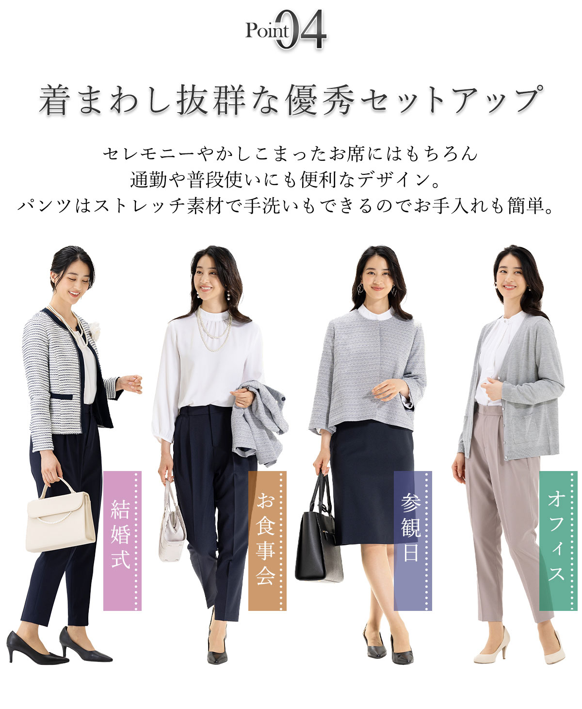 セレモニー対応パンツスーツについて「ゆったりシルエットでこなれ感あるスタイルに」オールシーズン対応仕様の選べるジャケットとパンツのセットです。ゆったりとしたAラインシルエットがトレンド感あるオーバージャケットを2種類の生地でご用意。パンツはヒップとお腹周りにゆとりがあり、足回りをすっきり見せてくれるテーパードパンツタイプです。フォーマルシーンはもちろんデイリー使いにも着まわせるセットアップ。ストレッチ素材なので着心地もよく、アクティブに働く女性にもお薦めです。 セレモニー対応パンツスーツの詳細 ジャケット ・ノーカラーオーバージャケット・長袖タイプ・無地またはミックス・縦横に伸びる2wyayストレッチ素材またはツイード生地・ポケット付き。裏地付き。 パンツ ・テーパードパンツ・ウエストゴム仕様。ベルトループ付き。・縦横に伸びる2wyayストレッチ素材・ご家庭で洗濯OK(洗えるウォッシャブル仕様) サイズ S・M・L・LL・3L・4L小さいサイズ〜大きいサイズ(ラージサイズ) カラー グレージュ(グレー)・モカ(茶)・ネイビー(紺色)・ブラック(黒)・ネイビーミックス・ブラックミックス 用途 入学式や入園式、卒業式や卒園式はもちろん、七五三・お宮参りなどフォーマルな装いがおすすめのシーンにぴったり。 授業参観などの学校行事、発表会など、上品かつきちんと感が求められる場面に、定番のきれいめセレモニースタイルとして。働くママにうれしいオフィスにもなじむデザインなので、通勤スタイルやオフィスカジュアル、会社関係の行事にもお使いいただけます。 スーツ&フォーマル専門店アッドルージュ スーツ&フォーマル専門店AddRouge(アッドルージュ)は、20代・30代・40代・50代の幅広い年代の女性を対象とした、通勤スタイルから冠婚葬祭まであらゆるシーンの服装を、ご提供するレディースファッションショップです。 スーツはこれから社会に出る20代女子のリクルートスーツから、OLや働くママとして活躍するアラサー・アラフォー、ミセス世代のビジネススーツまで様々なデザインをご用意。 ストレッチ素材で着心地を追求するなど、お客様の目線での他と被らない自社商品生産を行っています。 アッドルージュのマザースーツ ( ママスーツ ) は、卒園式や卒業式から、入園式や入学式はもちろん、参観日や学校行事にもお薦め。 華やかなデザイン性で、お子様の大切な記念日ともなる、七五三やお宮参りにもお使い頂けます。 フォーマルな装いが叶うので、結婚式や披露宴にも対応致します。 もちろんお葬式や告別式など、マナーに沿った服装が必要なブラックフォーマルもご用意。 スーツの通販に馴染みのないお客様にも、気持ちよくお買い物頂けますよう、精いっぱいお手伝いさせて頂きます。 17264 メーカー希望小売価格はメーカー商品タグに基づいて掲載しています。ブラウス バッグ バッグ ネックレス ブラウス ネックレス バッグ パンプス ブラウス ネックレス バッグ パンプス トップス バッグ ネックレス パンプス ジャケットやパンツのポケット 仮縫いについてはこちら ≫ しつけ糸の外し方 ≪ >>サイズの測り方<< 直ぐに着用したい方へおすすめ 裾上げテープ
