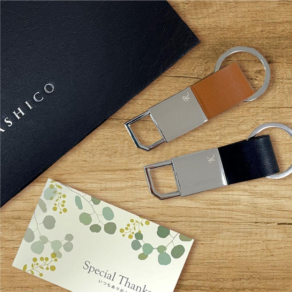 大切な人に贈る、高級感漂う本革名入れペアキーホルダー。 使い込むほどに味がでる上質な本革を使用。 メタル部分に刻まれた主張しすぎない小さめの刻印(名前・イニシャル・メッセージ・日付など)。 世代、年齢、性別を問わずお使いいただけるシンプルで落ち着いたデザインなので、 ・結婚記念日 ・クリスマス ・バレンタイン ・誕生日 ・父の日、母の日 ・還暦祝い など、特別な日や大切な方への贈り物にぜひご利用ください。 専門のスタッフが心を込めてラッピングさせていただきます。 ■■■専用のギフトBOX入り■■■ 商品詳細 カラー オークルブラウン・ブラック・ディープレッド・ネイビー・ダークブラウン・オレンジ・ピンク・ミントグリーン 材質 牛革/メタル サイズ 長さ(全長)約90mm、リング径32mm 重さ 約35g 配送方法 メール便 刻印内容 ■A.マーク+2行刻印 半角英数13文字まで ■B.ななめ(3行刻印) 半角英数13文字まで ■C.右下(3行刻印) 半角英数13文字まで 備考 ■現物に近い色味で写真を撮影しておりますが、モニターによって実際の商品と色味が異なってみえる場合がございます。 ■天然皮革という性質上、革そのものに個体差が生じます。 ■個体差によって発色の違いや製品の筋、傷が出る場合がございます。 ■表面の擦れ感やシワなどの表情が写真の印象と異なる場合がございます。 ■キーホルダーの金具を新仕様に変更いたしました。 旧タイプと新タイプがペアで混在する場合がございます。 よくご利用いただくシーン 長寿のお祝い 長寿祝い / 60歳 還暦(赤) / 70歳 古希(紫) / 77歳 喜寿(紫) / 80歳 傘寿(黄・金) / 88歳 米寿(黄・金) / 90歳 卒寿(白) / 99歳 白寿(白) / 100歳 百寿(白) 結婚記念日 1周年:紙婚式 / 2周年:藁婚式、綿婚式 / 3周年:革婚式、糖果婚式、草婚式 / 4周年:絹婚式、リンネル婚式、皮婚式、書籍婚式 / 5周年:木婚式 / 6周年:鉄婚式 / 7周年:銅婚式 / 8周年:青銅婚式、ゴム婚式、電気器具婚式 / 9周年:陶器婚式 / 10周年:アルミ婚式、錫婚式 / 11周年:鋼鉄婚式 / 12周年:絹婚式、亜麻婚式 / 13周年:レース婚式 / 14周年:象牙婚式 / 15周年:水晶婚式 / 20周年:磁器婚式、陶器婚式 / 25周年:銀婚式 / 30周年:真珠婚式 / 35周年:珊瑚婚式、翡翠婚式 / 40周年:ルビー婚式 / 45周年:サファイア婚式 / 50周年:金婚式 / 55周年:エメラルド婚式 / 60周年:ダイヤモンド婚式 / 65周年:碧玉婚式、ブルースターサファイア婚式 / 70周年:プラチナ婚式 お祝い 出産祝い / 結婚祝い / 誕生祝い / 内祝い / 出産内祝い / 引き出物 記念品 周年記念 / 両親への記念品 / 両親へのプレゼント / ホールインワン記念 / 卒団記念 / 卒部記念 / 優勝送記念 / 監督・コーチへのプレゼント 仕事関係のお祝い 退職記念 / 退職祝い / 定年退職 / 就職祝い / 栄転祝い / 昇進祝い / 開店祝い / 勤続記念 / 送別会 / 退官 / 勤続記念 / 上司へのプレゼント 入学・入園・卒業・卒園 入学祝い / 入学記念 / 入園祝い / 入園記念 / 卒園記念 / 卒業記念 / 卒業祝い / 進学祝い / 合格祝い / 先生へのプレゼント / 恩師へのプレゼント 季節のイベント バレンタインデー / ホワイトデー / 母の日 / 父の日 / 敬老の日 / クリスマス 贈る相手 男性 / 女性 / 父 / お父さん / パパ / 母 / お母さん / ママ / 子供 / 子ども / 男の子 / 女の子 / おじいちゃん / お爺ちゃん / おばあちゃん / お婆ちゃん / 祖父 / 祖母 / 妻 / 夫 / 彼氏 / 彼女 / 友達 / 友人 / 上司 / 先輩 / 孫 / 夫婦 / めおと / 両親 / カップル / 10代 / 20代 / 30代 / 40代 / 50代 / 60代 / 70代 / 80代 / 90代 / 100代大切な人に贈る 本革キーリングペアギフト 大切な人と お揃いのプレゼントに。 ※モニターや環境によって実際の商品と色味が異なってみえる場合がございます。 ※光の加減によって刻印の見え方は変わります ※特典は、投稿確認後のお届けとなります。 ※複数購入の場合でも、特典は1つとさせていただきます。 (それぞれ異なる特典を選ばれている場合は、その中から1つを当店でお選びいたします。) ※おまかせの場合、当店にてお選びいたします。 ※イベント時や長期休暇をまたぐ場合、通常よりお届けまでお日にちを頂戴します。