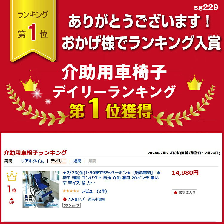 【12/4〜10%OFFクーポン】\ランキング1位獲得/【送料無料】 車椅子 軽量 コンパクト 20インチ 車いす 車イス 輪 カート 折りたたみ ブレーキ 介護 ノーパンク アルミ 多機能 アームレスト 跳ね上げ式 自走介助兼用 介護用品 軽量車椅子 福祉用品 アルミ製 sg229