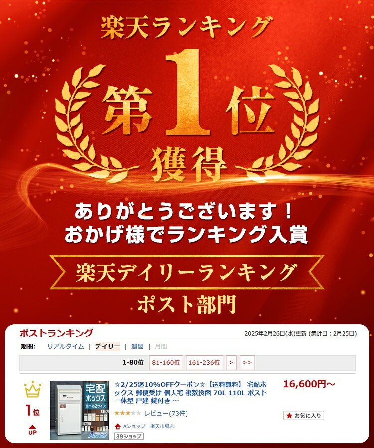 【11/30〜12/1限定クーポン】\楽天1位/【送料無料】 宅配ボックス 郵便受け ポスト 個人宅 複数投函 70L 110L ポスト一体型 戸建 鍵付き 後付け おしゃれ 一体 置き型 スタンド 宅配便 メール便 郵便 宅配ポスト box 通販 置き配 不在受取 大容量