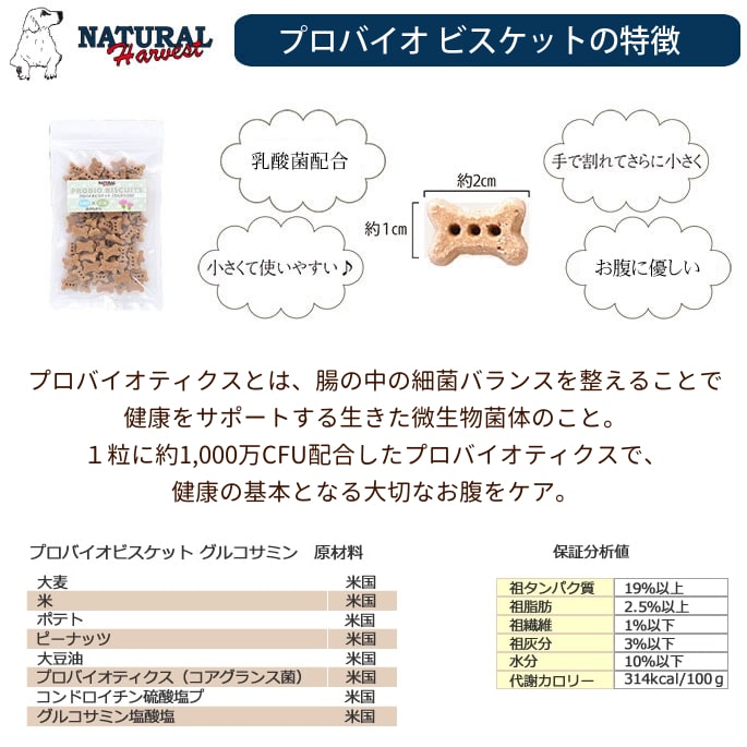 ナチュラルハーベスト 犬 おやつ プロバイオビスケット グルコサミン 【低リン】【低脂肪】 犬用おやつ 無添加 クッキー間接の健康維持にグルコサミン、コンドロイチンを配合