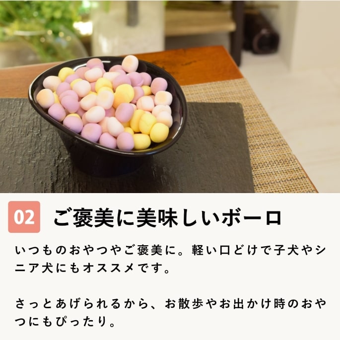 ※1 常温品と冷凍品混在時は11000円以上で送料無料 ※2 沖縄・北海道は11000円以上で通常送料無料、常温混在時は22000円以上で送料無料となります。 ※3 ただし在庫有りの商品に限る。土曜日は12時までとなります。 ※4 定休日:日曜日・第1第3土曜日・祝日となります。 ■お支払方法について ■購入後も安心の返品・交換について ■送料やお届け目安について ■会社概要 無添加 果物ミックスボーロ 無添加・無着色で自然な甘みと風味たっぷり、サクサクした食感が病みつきになる、ワンちゃんが楽しめる安心・安全のおやつです。 ■内容量 50g×5袋 ■原材料 馬鈴薯澱粉、メレンゲ、はちみつ、ブルーベリーエキス、バナナ果肉、さくらんぼ果汁 ■成分値 粗タンパク質1.1%以上、粗脂肪0.5%以上、粗繊維0.8%以下、粗灰分0.5%以下、水分3.0%以下、エネルギー 220kcal/100g ■原産国 日本 ■保存方法 直射日光、高温多湿を避けて冷蔵庫等冷暗所で保管してください。無添加の商品ですので、開封後はお早めにお召し上がりください。 ■ご注意 ★無添加商品ですので開封後はお早めにご使用下さい。 ★おやつはフードのかわりになりません、副食としてお使いください。 ★まるごと飲み込むとのどや食道に詰まる場合がありますのでご注意下さい。 ★おやつの与えすぎは肥満の原因になります。与えすぎにご注意下さい。 ■配送方法 ヤマト運輸 ■送料について のみ → 5500円以上送料無料 のみ → 5500円以上送料無料 ※沖縄・北海道・一部離島は11000円以上 +同時注文 → 11000円以上送料無料 ※沖縄・北海道・一部離島は22000円以上 冷凍商品と常温商品の同梱は出来ません。 送料表の常温品+冷凍品の料金をご参照ください。 ※金額変更の場合がございます。 冷凍同時注文の際や、沖縄北海道一部離島は追加送料など、ご注文後に金額修正をする場合がございます。 詳しくは【送料について】をご一読くださいませ。1袋 5袋セット 果物ミックスボーロ ヤギミルクボーロ