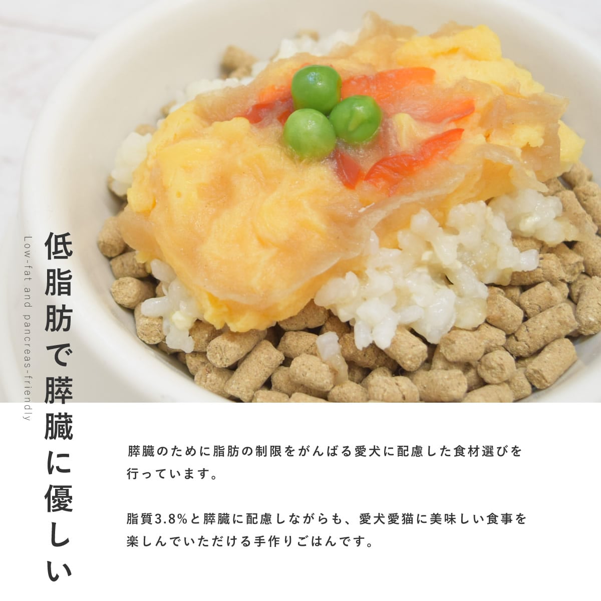 ※1 常温品と冷凍品混在時は11000円以上で送料無料 ※2 沖縄・北海道は11000円以上で通常送料無料、常温混在時は22000円以上で送料無料となります。 ※3 ただし在庫有りの商品に限る。土曜日は12時までとなります。 ※4 定休日:日曜日・第1第3土曜日・祝日となります。 ■お支払方法について ■購入後も安心の返品・交換について ■送料やお届け目安について ■会社概要 愛犬愛猫用 手作りごはん 卵たっぷり天津飯【冷凍便】【ハウンドカム食堂】 愛犬・愛猫の健康と幸せを願う気持ちを大切にして、忙しいあなたをお手伝いする愛犬愛猫の健康手作りご飯「ハウンドカム食堂」 毎日のご飯に「美味しい」と「健康」をプラスをコンセプトにお手軽で日替わりご飯で毎日あきさせる事無く「楽しい」ご飯を愛犬・愛猫に! ■原材料 卵、豆乳、米、鶏むね肉、赤パプリカ、グリンピース、くずでん粉、天然ダシ(鰹節・甜菜糖・酵母エキス・昆布・しいたけ粉末)、米油、ごま油、タウリン ■成分分析値 たんぱく質6.6%、脂質3.8%、炭水化物10.1%、水分79%、リン0.09%、ナトリウム0.049%、カリウム0.117%、カルシウム0.022%、マグネシウム0.014% カロリー:1トレーあたり 約92.9kcal ※手作りのため、成分・カロリーには個体差がございます。 ※この値は目安となります。 ■食べ方 冷凍でお届けです。食べる分だけ冷蔵庫で解凍して与えて下さい。 解凍後は、冷蔵庫保存し2日以内に食べきって下さい。 お急ぎの場合は電子レンジでチンもできます。 ■保存方法 冷凍庫で保存してください。 お届け後は、冷凍保存で約6ヶ月保存いただけます。 ■配送方法 ヤマト運輸 ■送料について のみ → 5500円以上送料無料 のみ → 5500円以上送料無料 ※沖縄・北海道・一部離島は11000円以上 +同時注文 → 11000円以上送料無料 ※沖縄・北海道・一部離島は22000円以上 冷凍商品と常温商品の同梱は出来ません。 送料表の常温品+冷凍品の料金をご参照ください。 ※金額変更の場合がございます。 冷凍同時注文の際や、沖縄北海道一部離島は追加送料など、ご注文後に金額修正をする場合がございます。 詳しくは【送料について】をご一読くださいませ。 低脂肪 低脂質 膵臓 犬 手作り ごはん ドッグフード 冷凍 商品 冷凍ごはん 冷凍 フレッシュ ドッグフード 無添加 愛犬 ドッグ 低カリウム 低ナトリウム ハウンドカム食堂 腎臓療法食のふりかけにCATEGORYカテゴリから選ぶ 単品まとめ買い 7品目セット 便利なトッピング 便利なお惣菜 おやつ&スイーツ 季節/旬の限定品 お悩みから選ぶ ■お届けについて必ずお読みください こちらは冷凍商品となりますので 常温商品と同時にご注文いただいた場合は、送料がそれぞれに発生いたしますことをご理解ください。