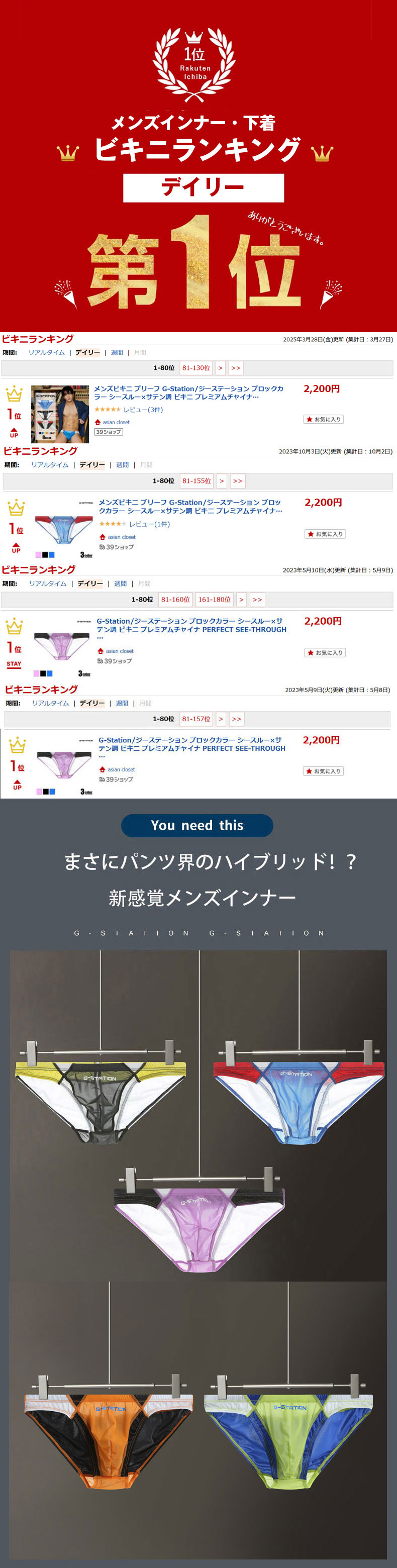 メンズビキニ ブリーフ G-Station/ジーステーション ブロックカラー シースルー×サテン調 ビキニ プレミアムチャイナ PERFECT SEE-THROUGH メンズビキニ 透け シースルー メンズ 男性下着 パンツ サテン調 光沢
