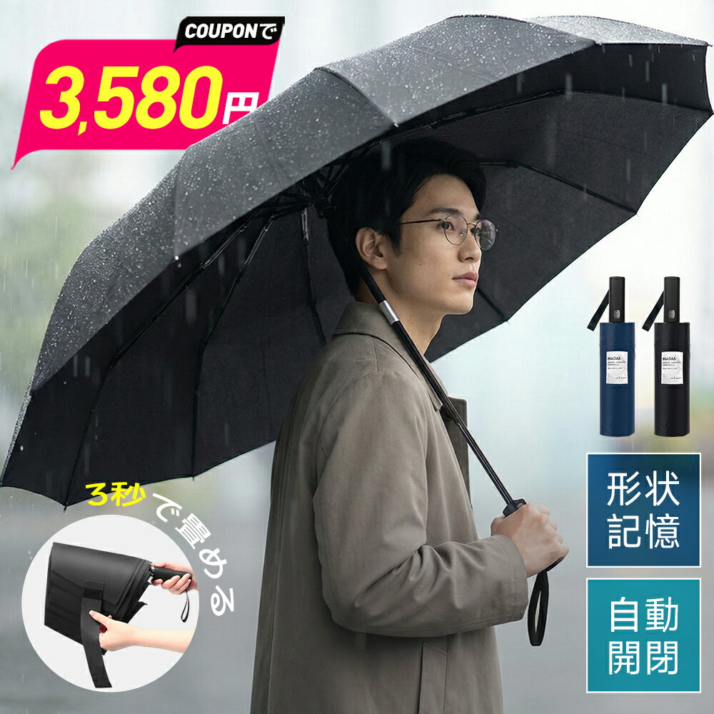 【3,580円◎発売限定クーポンで】 折りたたみ傘 形状記憶 傘 3秒で畳める 折り畳み傘 自動開閉 12本骨 耐強風 ワンタッチ 超撥水性 コンパクト 晴雨兼用 軽量 380g 逆戻り防止機能 傘面が大きめ 傘カバー 太バンド 収納ポーチ付 男女兼用 無地 ビジネス 通勤 通学