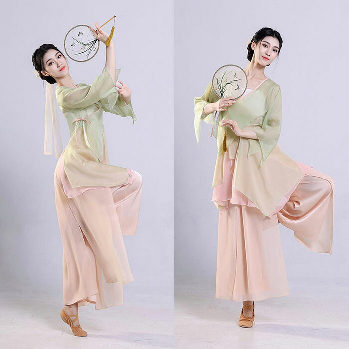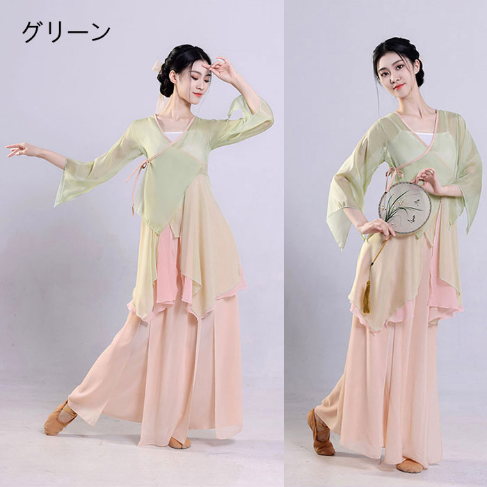 古典ダンス衣装 チュールトップス シースルーブラウス 前開き Vネック フレア袖 イレギュラー裾 パンツ キャミソール 無地 チャイナ風古典ダンスウェア 練功服 民族風 舞台衣装 中華ダンス 飄逸 レッスン着 エレガント