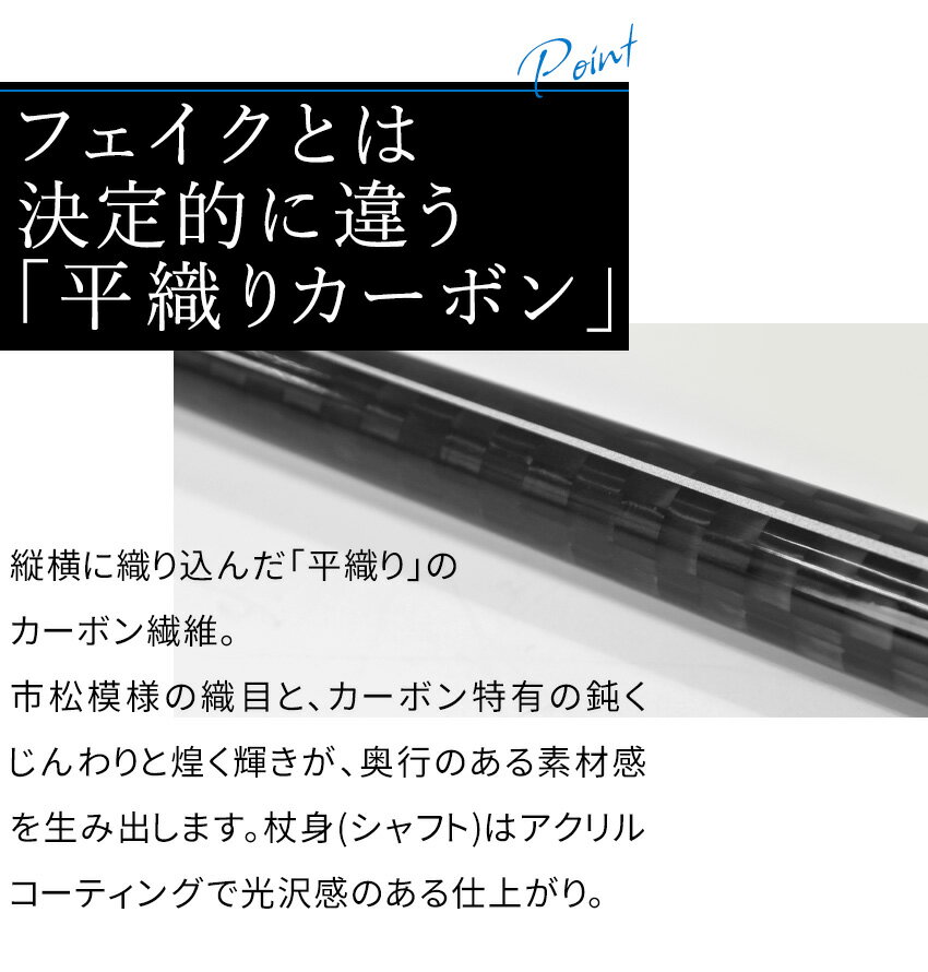 MONTAGNE.オリジナル 超軽量 カーボン製一本杖 モンターニュオリジナルのカーボン製一本杖。 当店モンターニュを運営する会社(株式会社 ASK TRADING)は、カーボンフレームの自転車ブランド「BOMA」も展開しているカーボンのプロフェッショナルです。 軽くて頑丈というカーボンの利点を活かして作られた一本杖は、杖を必要とする方の負担を軽減し、自分で歩く楽しさを感じてもらいたいという想いを込めて、細部までこだわって仕上げています。 歩行をしっかりとサポートする機能性を追求しつつ、常に身近に置くものだからこそ出来る限り軽く、カーボンの上質さを活かしたワンランク上のビジュアルも妥協しません。 体重をかける杖は安全が第一、そこでグリップから杖先まで継ぎ目のない一本杖にこだわりました。カーボンの頑丈さも相まって、折れにくさ・変形のしにくさは他素材とは一線を画します。 地面をしっかりと捉えて滑りにくい杖先のゴムパーツは、ゴムの中に座金を入れて補強しています。ゴムがすり減ってきたら取り外して、付属の予備パーツに付け替えが可能。 また、お客さまからのご要望を受け、現行ロットは取り外し可能なハンドストラップ付きとなり利便性がアップ。手首にかけて杖を握ることでうっかり杖を倒してしまう心配もなく、お会計時に杖の置き場に困ることもなくなりました。 本物のカーボンを使用した高級感のある杖は、プレゼントとしても最適です。 関連商品 カーボンアイテム一覧 サイズ 全長:76〜92cm(2cm刻み9サイズ)先端ゴムパーツの直径(地面と接する部分):約29mm 重量 約125g(+-10g) ※サイズにより多少異なります。 材質 本体:炭素繊維 杖先:ゴム製 セット内容 杖、ハンドストラップ、予備の杖先 注意事項 サイズの都合上、ラッピング不可商品です。多少の傷・色剥げ・生地のシワ等がみられる場合がございます。材質・製造工程・輸入運搬事情により避けられないものとなりますので、予めご了承願います。 入荷ロットにより色味が多少異なる場合がございます。
