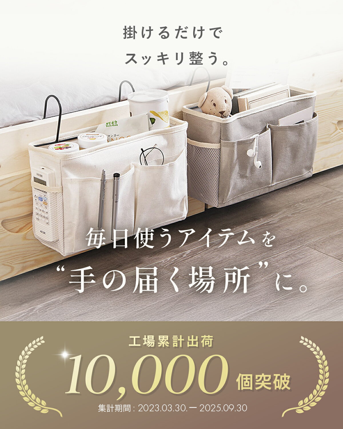 【商品詳細】 商品名 : ベッドサイドポケット 内容物 : 収納本体:1個 素材・サイズ : 素材:オックスフォード生地+スチールフック サイズ:メイン収納 横30cm × 奥行11cm × 高さ18.5cm フロントポケット 約14×14.5cm サイドポケット 約10.5×11.5cm 耐荷重 8kg 商品詳細 : ◆大小ポケット&2つのフックで“手の届く収納”を実現。 ベッドサイドはもちろん、リビング・車内など、散らかりやすい場所をスッキリ整えます。 ◆A4サイズ対応のワイドメインポケットには、本やタブレットも収納OK。 外ポケットにはスマホ・メガネ・リモコンなど、よく使う小物をサッと取り出せます。 ◆フック部分にはアイマスクや懐中電灯などを掛けて◎ 入院・介護中は“枕元収納”として、子育て中は“おむつ・おしりふき収納”にも活躍します。 ◆キャビネットの扉や椅子の背もたれにも掛けられるマルチ設計。 ◆シンプルで空間に自然になじむデザイン。 ◆使用しないときは折りたたんでコンパクトに収納可能。 取扱説明書 : 付属しません 保証期間 : 商品到着から1年間 [お客様都合による返送時の送料はお客様負担になります] 注意事項 : ※設置時はベッドや椅子、車などの固定箇所にしっかりと取り付けてください。 ※幼児の手の届く場所には設置しないでください。 ※火気や鋭利な物の近くで使用しないでください。 使用シーン : ベッドサイド 収納 ベッドサイドポケット 吊り下げ収納 入院 便利グッズ 入院グッズ ベビーベッド 収納 収納ベッド ベッド 収納 かご 収納 グッズ収納 テーブル 収納 フック付きカゴ ベッド上 収納 入院バッグ ベッド柵 オムツストッカー リモコン 収納 デスクサイドホルダー ウォールポケット つりさげ 収納 ウォールポケット 壁掛け ソファーサイドテーブル ベッドした収納 おもしろ シートバックポケット ベビーカー バッグ ベッド横 小物収納 ベッドサイドラック ベッドガード ベビーラック ベビーカーバッグ ベッド下収納 ウォールポケット a4 雑誌 収納 デスクサイドラック ぬいぐるみ 収納ポケット サイドポケット ポケット リモコンポケット 小物入れ 高齢者 サイドテーブル ハンギングボックス 人気 大容量 小物置き 車 ソファー ソファーサイド収納ポケット ソファーベッド チェアサイドポケット ドア フック ポーチ レザー 仕切り 収納グッズ 収納ボックス 吊り下げ式 吊り下げ机下 後付け 枕元 棚 椅子 物入れ 白 車用 雑貨 3段 5ポケット おむつ おもちゃ さき さく つり下げ ぬいぐるみウォールポケット ぬい活 ひっかけ ひっかける オシャレ オフィス文具 キャスター付き キャンプ クランパー クローゼット吊り下げ収納 グレー ケージ コンパクト収納バスケット 収納バッグ 物入れボックス 寝室 整理 スマホ コード 充電器 ケーブル メガネ 介護 子ども部屋 子供部屋 撥水 車内 吊り下げ ソファーサイドポケット 吊下げラック ベッド横 整理整頓 シンプル 可愛い おしゃれ ハンギングバッグ リモコン入れ すきま収納 ラック 保証 簡単 おすすめ 10代 20代 30代 40代 50代 60代 プレゼント 送料無料
