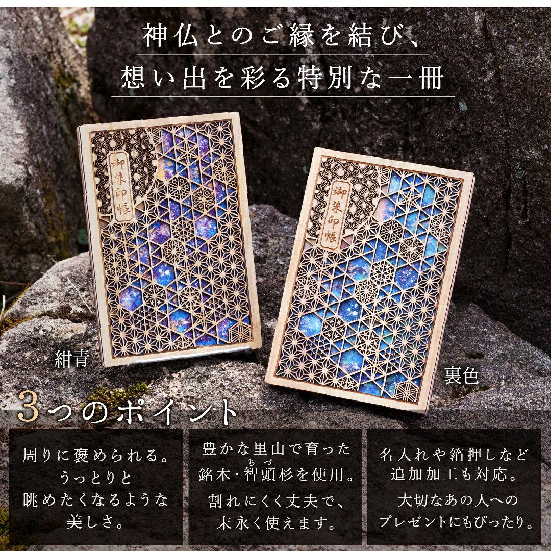 商品情報素材智頭杉(ちづずぎ)、杉ボード、和紙サイズ横約11.9cm×縦約17.9cm(大判サイズ)ページ数じゃばら折 28ページJANコード4580780242921アウトレット品としての注意点当店のアウトレット品は、通常の商品と比べて価格を抑えてご提供しております。そのため、以下のような特性がある場合がございますので、あらかじめご了承ください。・表紙のキズ・研磨による薄れ・汚れ:商品表面に小さなキズがある場合や、研磨作業の過程で表面の材が薄く削れ、芯材が透けている場合があります。これらは製造過程でやむなくできてしまったキズや薄れであり、商品の強度や耐久性には問題ありません。また、シール跡等の軽微な汚れがある場合があります。・ページ汚れ・毛羽立ち:製本作業の過程で、中の和紙にノリによる汚れやシミ、毛羽立ちが出ることがあります。こちらも商品の強度や耐久性に問題はありません。御朱印を頂く際の妨げになるほどではありませんが、気になる場合は書置きの御朱印を上から貼ってご使用ください。・ページ数違い:正規品とページ数が異なる場合があります。 これらの点はアウトレット品の特性としてご理解いただき、ご購入後の返品や交換には応じかねますことをご了承ください。また、名入れ・ページ増量・表題変更等のオプションは非対応です。何卒ご了承ください。その他の注意点●天然木の性質上、木目の違い、ゆがみ、変形・色違い、ヤニ、焼け焦げ、バリ、節等があります。●木は自然素材ですので木目パターンは一定ではありません。●表紙に使用している和紙は切り取る位置により柄が異なります。1つ1つ、違った色合いをお楽しみください。●落下衝撃等による破損・傷にご注意ください。浅い傷は400番以上の細かい紙やすり等で少しずつ削れば目立たなくなります。(やりすぎると表面の智頭杉が剥げてしまうためご注意ください。)割れた部分は木工用ボンドで接着すれば復元できる可能性があります。●モニターの発色により実際と異なる場合があります。●本製品は組子文様をデザインに取り入れた製品であり、組子細工の技法で制作した物ではありません。●御朱印帳に使用している蛇腹和紙の原紙には、木片や黒点などの異物(夾雑物)が一定量混入している場合がございます。これは和紙の製造工程において避けられないものであり、不良品ではありません。ご理解のほどお願いいたします。関連商品正規価格品はこちらあすなろ御朱印帳 花鳥風月 / 月-紺青-訳あり★アウトレット品★【 あすなろ御朱印帳 花鳥風月 / 月(品質レベル2)】 日本製 高級 木製 智頭杉 名入れ 箔押し ご朱印帳 御城印帳 納経帳 集印帳 大判 サイズ 杉 すぎ 桧 檜 ひのき 天然木 国産 和紙 書置き 書き置き 切り絵 外国人 伝統 和柄 和風 組子 天然木 和風 組子 縁起 おしゃれ 豪華 人気 鳥取 プレミアム かっこいい 男性 女性 母の日 父の日 敬老 クリスマス 正月 プレゼント ギフト 旅行 初詣 帰省 神社 寺 伊勢参り 美しい 5