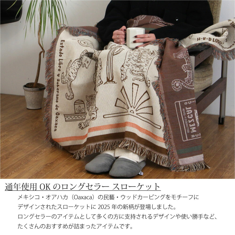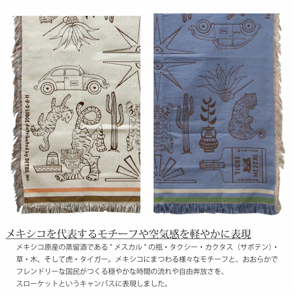 特徴 メキシコ・オアハカ(Oaxaca)の民藝・ウッドーカービングをモチーフにした スローケット。 メキシコ原産の蒸留酒である"メスカル"の瓶・タクシー・カクタス・草・木、 そしてタイガー。 メキシコにまつわるモチーフと緩やかな時間の流れや自由奔放さを、 スローケット1枚のなかに表現しました。 素材は、ポリエステルの耐久性とコットンの通気性の両方を特性を備えた ポリエステルコットン生地。 少し厚みがありながらも艶感があり、触り心地の良い通年ご使用いただける 生地感です。 インテリアに馴染みやすいカラーリングとデザインで、2色展開。 "クリーム"はナチュラルや北欧テイストに、"ブルー"はヴィンテージや メンズテイストに相性がよく、性別を問わず幅広くご使用いただけます。 ソファやベッドにさらりと掛けて、肩から羽織れる大判サイズは膝掛けとして、 タペストリーのように壁面アートとしてなど、様々なシーンでお部屋を 彩ってくれます。 材質 ポリエステル 70% 綿 30% サイズ 約W120 × H146cm + フリンジ 備考 ・本製品は繊維製品の特性上、 デザインのスレ ・色ムラや織りムラなどにより、 線状や黒点のような箇所が生じる場合がございます。 ・サイズを含め個体差がございますので予めご了承ください。 ・洗濯可ですが製品の特性上、縮む場合がございます。 納期 即納(店舗在庫がない場合はお取り寄せ商品となります。通常5~7営業日以内の発送)