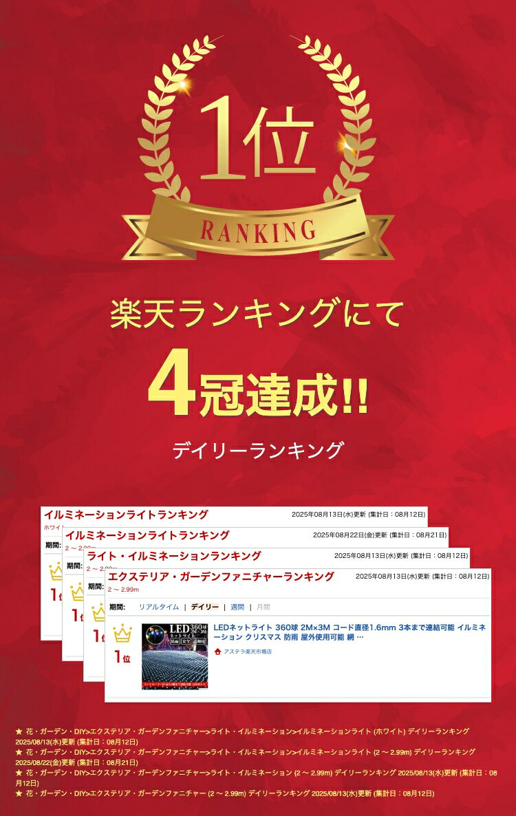 LEDネットライト 360球 2M×3M コード直径1.6mm 3本まで連結可能 イルミネーション クリスマス 防雨型屋外使用可能 LEDイルミネーション 8パターン 50球 5m 自動ON/OFF クリスマス 屋外 LED イルミネーション クリスマス ライト mix ミックス カラー 白 ホワイト 金 シャンパンゴールド 青 ブルー 緑 グリーン 紫 パープル 赤 レッド コントローラ付 ストレート 電飾 防雨関連商品LEDネットライト 360球 2M×3M コード直径1.6mm 3本ま...LEDチューブライト ロープライト 防水電源付き 8色可選 2芯タイプ...LEDチューブライト ロープライト 防水電源付き 8色可選 2芯タイプ...4,580円4,980円4,880円LEDネットライト 120球 1M×2M コード直径1.6mm 5本ま...イルミネーション ライト LED クリスマス ストレート 200球 2...イルミネーション ライト LED クリスマス ストレート 200球 2...2,580円2,980円2,980円LEDチューブライト 3芯 防雨型電源コントローラー付き 8色可選 1...LEDチューブライト ロープライト 防水電源付き 8色可選 2芯タイプ...LEDスノーフォールライト 50cm 10本 540球 コード直径1....6,980円4,980円2,980円LEDネットライト 360球 2M×3M コード直径1.6mm 3本ま...LEDネットライト 120球 1M×2M コード直径1.6mm 5本ま...イルミネーション ライト LED クリスマス ストレート 100球 1...20,500円2,280円1,980円網目状になっているコードに淡いライトブルーの電球が組み込まれているタイプのイルミネーションです。長方形型になっており、連結していただくと広い面積の飾りつけが簡単にできます。植え込みや、ベランダ等を一面ライトアップされたい時に適しています。 【商品仕様】 サイズ 2m×3m led球数 360球 定格入力電圧 100v 材質 導線:直径0.12mmニッケルメッキ銅線(10本) 表面:紫外線に強いpvc使用 コード ブラック(直径1.6mm) 消費電力 約7w 防水等級 ip44 寿命 約40,000時間 ※表示寿命は設計寿命であり、製品の寿命を保証するものではありません。 連結可否 最大3本まで連結可能 コントローラー 8パターンのコントローラー付き。 ご注意 ★発送前に検品を行いますが、海外輸入品の為若干傷・汚れが 付いている場合がございます。予めご了承くださいませ。 ★電源プラグは防水型ではありません。 ★コントローラー本体は防水仕様となりますが、念のため附属の袋で被せてお使いください。 ★取付け工事前のled不点灯(5球以上)については交換いたします。 ★画像はイメージです。 ★商品の色は、コンピュータディスプレイの性質上、実際の色とは多少異なります。 ★仕様は予告なく変更する場合があります。 ★実際の商品とデザイン、色、仕様が一部異なる場合がございます。
