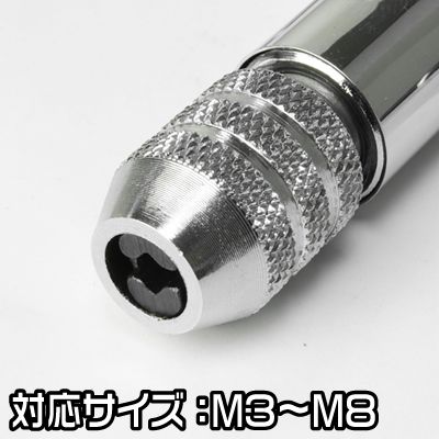 ■商品仕様:・本体サイズ:L85×φ20mm・ハンドル長:100mm・対応タップサイズ:M3?M8■商品説明:タップやエキストラクターを差し込むことができる、専用ラチェット式ハンドルになります。回転方向の切替が可能で、上部ハンドルは、スライドさせての使用が可能です。■注意事項:※本来の目的以外では、使用しないで下さい。【アストロプロダクツ オリジナル商品】ラチェット機構だから持ち替える必要がありません。