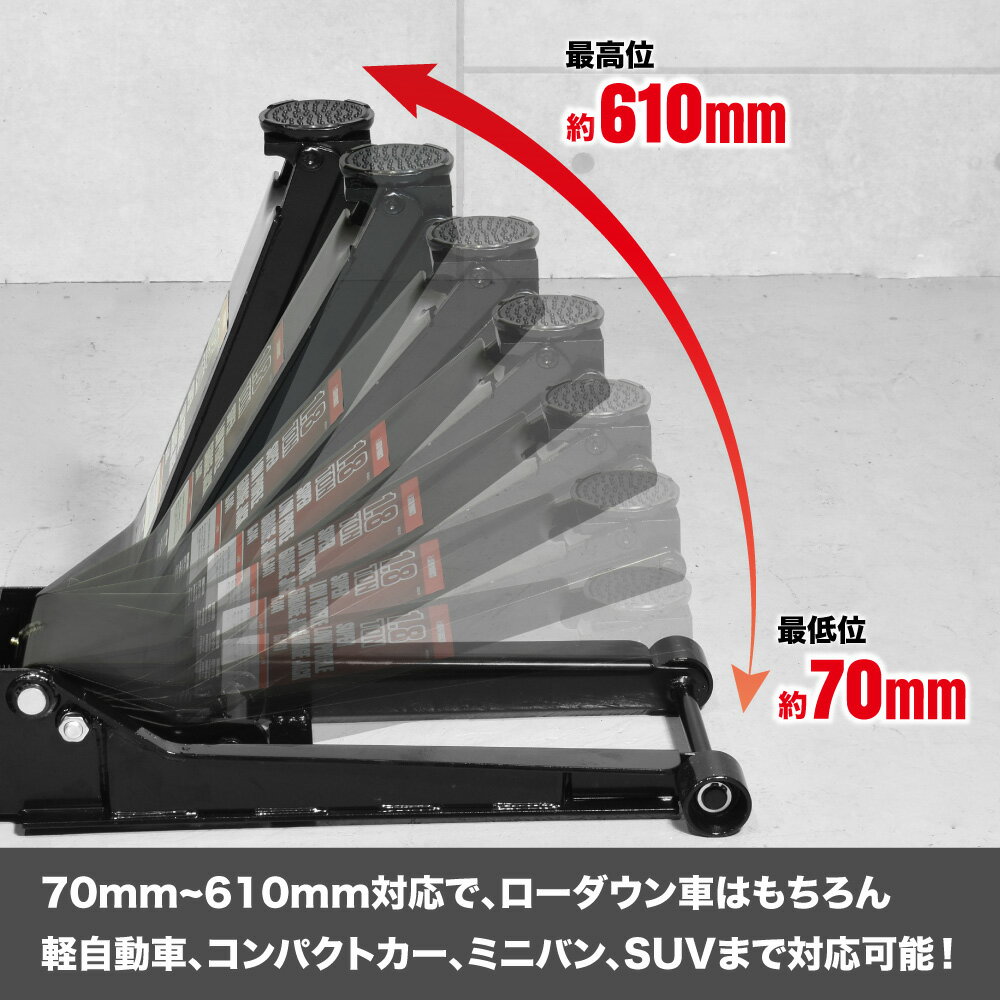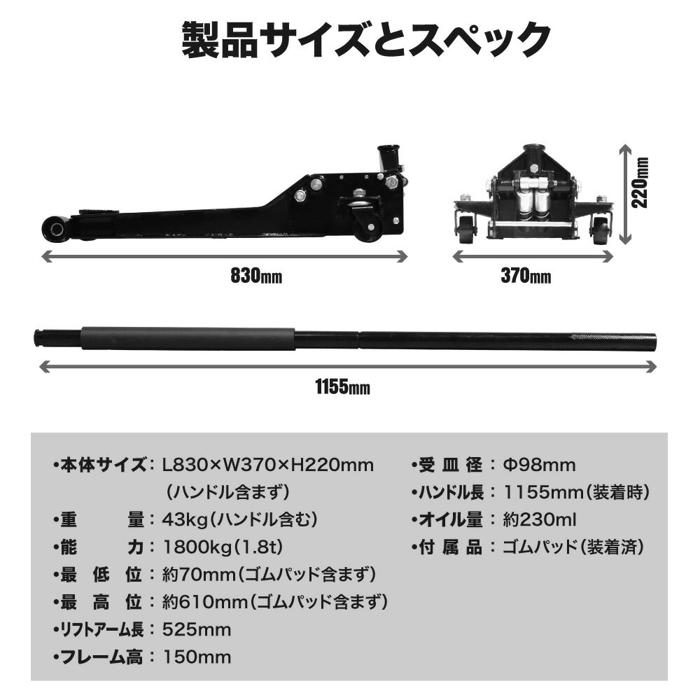 ■商品説明:軽自動車から普通自動車に対応した、能力1800kg(1.8t)の、超低床ジャッキです。アーム全体を、低く、長くすることで、最低地上高の低い車やジャッキポイントが奥まっている車に重宝します。2つのポンプピストンで、少ないストロークでアームを上げることができます。受皿は滑りにくく、傷つけにくいゴムパッドを標準装着しています。■商品仕様:・本体サイズ:L830×W370×H220mm(ハンドル含まず)・重量:43kg(ハンドル含む)・能力:1800kg(1.8t)・最低位:約70mm(ゴムパッド含まず)・最高位:約610mm(ゴムパッド含まず)・受皿径:φ98mm・リフトアーム長:525mm・フレーム高:150mm・ハンドル長:1155mm(装着時)・オイル量:約230ml・付属品:ゴムパッド(装着済)■注意事項:※本製品は、軽自動車~普通自動車の昇降に用いるジャッキです。※使用前には、必ず取扱説明書を熟読し、本製品の使用方法をよく理解してださい。