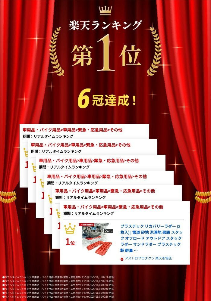 ■商品説明:砂地や泥濘地、雪道でのスタック時に活躍するプラスチック製のリカバリーラダーです。アクティブなオフローディングを楽しむ方はもちろん、雪道の備えとしてもおすすめです。表面の突起は、しっかりとトラクションを確保し、裏面の凹凸は柔らかい路面でも滑りにくくなっています。また、広い面積で車重を支えるので、タイヤが沈みにくく脱出の可能性を上げます。複数セットを使って脱出の可能性を上げることも可能です。プラスチック製で軽量なだけでなく、薄くなった端部はスコップ代わりに使用できます。■商品仕様:・本体サイズ:W690×D280×H67mm・重量:1.25kg・推奨車両重量:?3t(2枚使用時)・推奨タイヤ幅:?235mm・使用環境温度:-10?40℃・材質:PP・入数:2■注意事項:※必ず推奨車両重量以下の車両で使用してください。※車両のタイヤ以外の部分が接地してしまっている場合など、状況によっては、必ずしも脱出できるわけではありません。※使用環境、状況によっては、推奨車両重量以下の車両でも製品が破損することがあります。※使用時にラダーが飛び出すことがあります。最大限安全に留意して使用してください。※本製品上でタイヤを空転させないでください。※割れや欠け、破損がある場合は、絶対に使用しないでください。※車外など、直射日光が当たる場所に長時間放置しないでください。※製品の特性上、使用によって割れや破損などが発生した場合、商品の不具合としては認められませんので、予めご了承ください。※本製品を使用して起こった破損や損害に対して、当社では一切の保証、並びに責務を負いかねますので、ご了承ください。