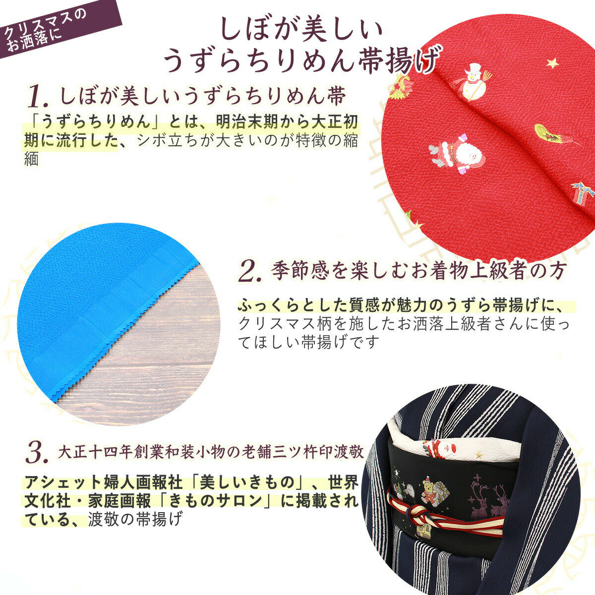 帯揚げ クリスマスのお洒落に 渡敬謹製 うずらちりめん サンタ クリスマス柄 [商品番号coa4530]【あすかや】