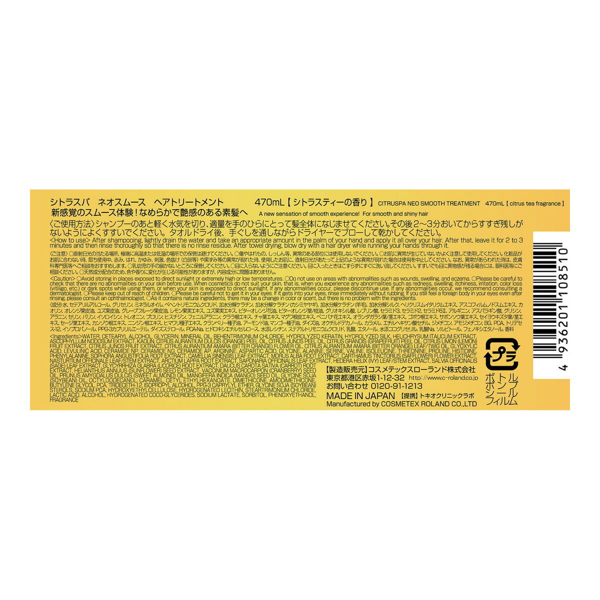 【夜の市★合算2千円超で送料無料対象】コスメテックスローランド シトラスパ ネオスムース トリートメント 本体 470mL シトラスティーの香り