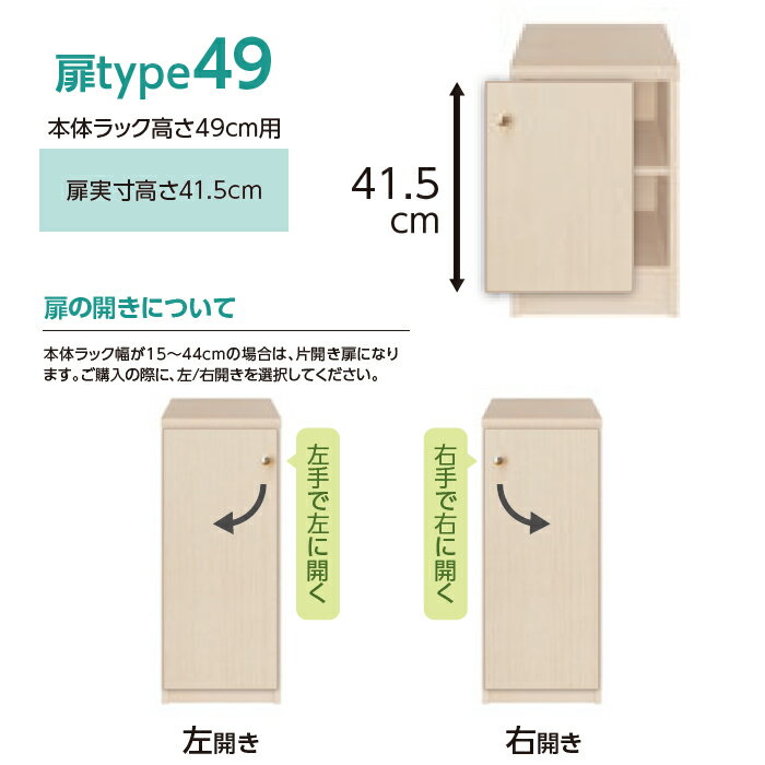大洋 TAIYOシェルフィット エースラック カラーラック専用の扉です。※本体は付属しておりません(扉のみです)サイズ(本体ラックのサイズで選びます。扉の実寸ではございません)本体ラック横幅25〜44cmより選択本体ラック奥行全てに対応本体ラック高さ49cm用扉の開きについて扉は、片開き扉になります。ご購入の際に、左/右開きを選択してください。本体:プリント紙化粧繊維板塗装:ウレタン樹脂塗装ソフトダンパー:扉を閉める際の衝撃を和らげます。※扉1枚につき1個を蝶番に取り付けます。取り付けはワンタッチです。ハンドルタイプ:ラインハンドル扉を取り付ける際は、本体ラックに付属のジョイントプレート(平ステー)や転倒防止補助バンド・突っ張り棚などで本体を固定してください。※ご注文サイズにお間違いのない様ご注意ください。間違いによる交換はできません。※商品の色に関して色合いによる返品・交換はお受けいたしかねます。予めご了承ください。※契約問屋より発送