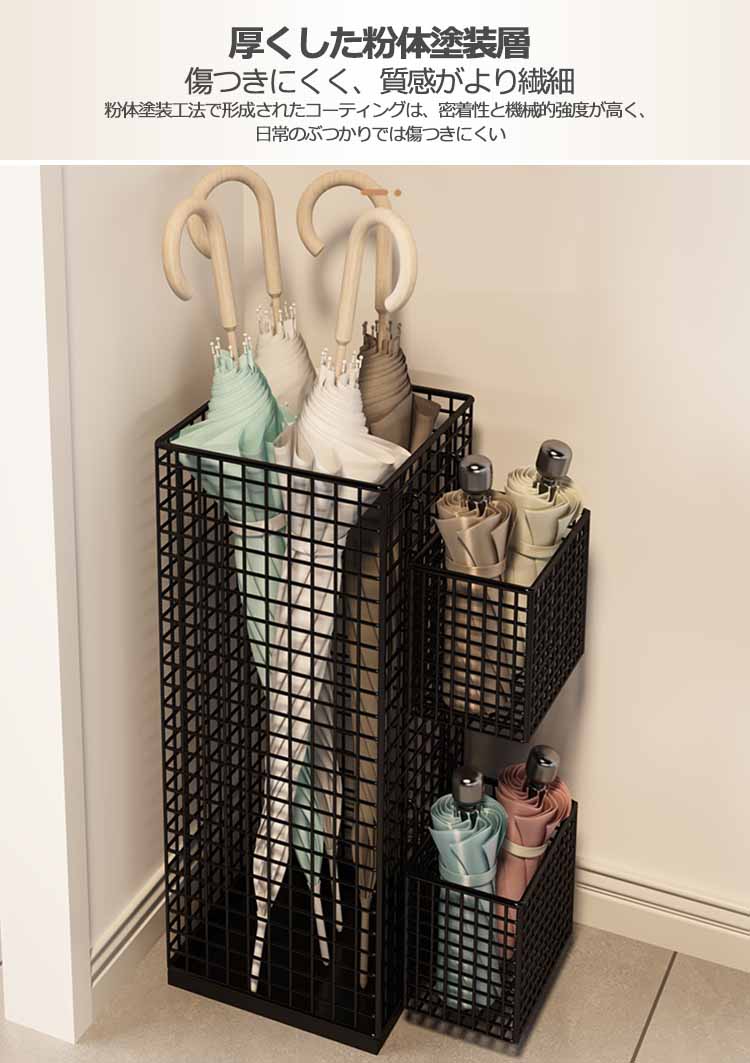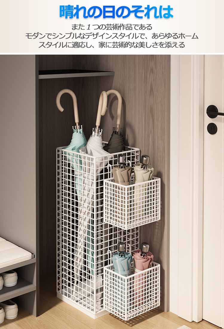 おしゃれで実用的! 玄関の悩みを解決する「スタイリッシュ傘立て」 雨の日も晴れの日も、玄関の「傘の乱雑さ」にお悩みではありませんか? 当商品『モダンラック傘立て』で、収納力×デザイン性×機能美 を実現! 1. 大容量&使いやすさ ✅ 8本以上収納可能:長傘・短傘を「エリア分け」収納(大きなメインラック+小さなサブバスケット)。家族の傘や来客用の傘も、スッキリまとめられます ✅ コンパクトサイズ:僅か0.04平方メートル(20cm×20cm)の設置スペース。小さな住居でも足元が邪魔にならず、玄関の狭いコーナーにも最適 2. 優れた機能設計 ✅ 通風遮るなし構造:網目状のデザインが空気の通りを妨げず、濡れた傘が自然に乾燥! カビや臭いの心配が減り、メンテナンスフリー ✅ 丁度良い高さ:約50cmの高さで、長傘の本体が外に出にくく、水滴が床に落ちにくい。汚れが気にならない玄関づくりに ✅ 深めの水切りトレイ:傘から落ちる水滴をしっかり受け止め、床が水浸しになるのを防ぐ。お手入れも簡単(トレイを取り出して洗える) 3. 耐久性とデザインの両立 ✅ 耐食性粉体塗装工法:自動車部品にも使われる高防錆塗装。雨水や湿気に強く、長期使用でも錆びにくく美しさを保てます ✅ モダンミニマルデザイン:シンプルなラックスタイルが、あらゆるホームスタイル(北欧・現代・シック)に馴染む。晴れの日は「玄関の小さなアート」として、居心地を高めます 4. ラインナップ ホワイト 清潔感のあるトーンで、明るく開放的な玄関に最適 ブラック 大人しく落ち着いた雰囲気で、シックな空間に相性抜群 ・仕様:シンプルタイプ(長傘のみ)/1つ折り傘立て付き/2つ折り傘立て付き から選択可能 雨の日のストレスを減らし、玄関の印象を一変させる「スタイリッシュ傘立て」。 ぜひお試しください✨