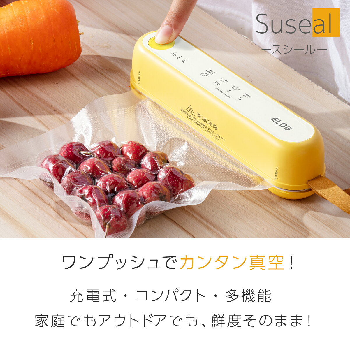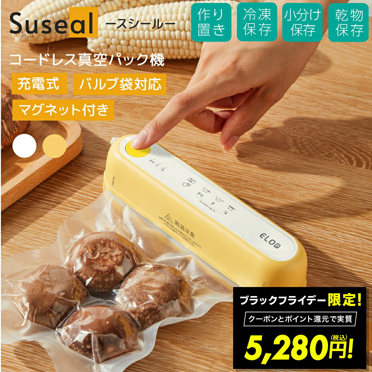 年に一度のBlack Friday開催!! 【期間限定】日替わりクーポン配布! Black Friday特別クーポン配布中!! たった10秒で鮮度が変わる!カンタンワンプッシュでぎゅぎゅっと強力真空■コードレスでどこでも使える充電式バッテリー搭載で、コンセント不要!キッチンはもちろん、キャンプやアウトドアでも手軽に使えます。コードが邪魔にならず、ストレスフリーで快適に真空パックが可能です。■コンパクト&軽量デザイン片手で持てるスリムサイズだから、収納にも困りません。狭いキッチンでも省スペースで使えて、持ち運びにも便利。いつでもどこでも新鮮保存が簡単に!■三種のモードで多彩なニーズに対応 1. 自動吸引モード:ワンタッチで自動的に真空パックとシーリングを行います。食品の種類や状態に合わせて、最適な吸引圧をかけることで、食材の形を崩さずに鮮度を長持ちさせます。 2. シーリングモード:真空にせず、袋の口をシールするだけのモードです。お菓子や乾物など、湿気を避けたい食品の保存に最適です。 3. 外部吸引モード:専用のホースを使用して、ワインボトルや保存容器の空気を抜くことができます。多様な保存方法に対応し、キッチンの可能性を広げます。■さまざまな袋に対応専用袋だけでなく、市販のエンボス加工袋やエアバルブ付きの真空パックなどにも対応。食材の種類や用途に合わせて、自由に選べます。コストを抑えて経済的!■安心の6ヶ月メーカー保証付きご購入後も安心!本製品は日本国内のサポート体制を完備し、万が一のトラブルやご不明点にも迅速に対応いたします。[ご確認ください]※本体の内部にある薄紫色のスポンジ状の緩衝材は外してご使用ください。※水分のあるもの、液体のシーリングは可能です。吸引はできません。※商品の色はモニターの具合で実物と若干異なる場合がございます。予めご了承下さい。※デザイン、仕様等につきましては、予告なく変更する場合がございます。予めご了承下さい。 商品詳細 商品名 充電式コードレス真空パック機 Suseal サイズ 約190×45×48mm 重量 約300g 材質 ABS 電源 USB充電式 バッテリー 1500mAh(18650 li-ion) 電圧 DC5V/2A 定格電力 7.4V/5.5A/40W 電源タイプ USB Type-A 差込口 USB Type-C 吸引力 60kPa シール幅 3mm 充電時間 約180分 セット内容 ・本体・バキュームチューブ・バキュームヘッド・充電ケーブル・真空パック用袋×5枚(25×15cm)・交換用シーラーテープ1枚・説明書 バリエーション ・ホワイト(ALCC-FY-F02-WH)・イエロー(ALCC-FY-F02-YL) パッケージサイズ 250×75×60mm / 425g 保証期間 6ヶ月 生産国 中国 メーカー ELOD 検索関連キーワード 4570036750690 4570036750706 Suseal スシール CS001A White Yellow 真空シーラー バキュームシーラー 自動真空容器 真空パック機 シーリング 自動 備蓄米保存 真空保存 簡単真空 時短料理 冷蔵保存 作り置き 鮮度キープ 保存 ナッツ 豆 野菜 スパイス 食品保存 フードロス 保存食 長期保管 ドライフード ペットフード 茶葉 コーヒー豆 調味料 作り置き 時短料理 時短 保存容器 おしゃれ お洒落 オシャレ スタイリッシュ デザイン シンプル おすすめ オススメ 人気 話題 流行り 一人暮らし ひとり暮らし 自炊 弁当 オフィス 単身赴任 おひとり様 介護 クラウドファンディング クラファン 成功商品 マクアケ makuake プレゼント ギフト 贈り物 お祝い 誕生日 バースデー クリスマス バレンタインデー ホワイトデー 新生活 結婚祝い 母の日 父の日 プチギフト 関連ワード: 充電式コードレス真空パック機 elod suseal スシール 真空保存 食品保存 小型真空パック 食材保存 フードシーラー 脱気シーラー 自動吸引モード シーリングモード 外部吸引モード 真空パック機 密封シーラー 食品密封 家庭用真空パック 真空シーラー バキュームシーラー 備蓄品 備蓄米 USB充電式 省スペース コンパクト スリムデザイン 軽量デザイン 持ち運び便利 ワンタッチ操作 真空パック用袋対応
