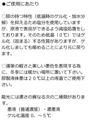 【 特徴 】 上質な植物性芯焚油煙 墨色:紫紺系 香り:白檀 ●この龍光は、固形墨と同じ原料(天然二カワ)を使用した液体墨です。 ●この墨液は原液で表具できます。 ●墨色は力強い紫紺系の美しい色調 膠に含まれるコラーゲンの働きが伸びの良い滑らかな書き味を作り出しています。 ●固形墨を磨り込むことができます。